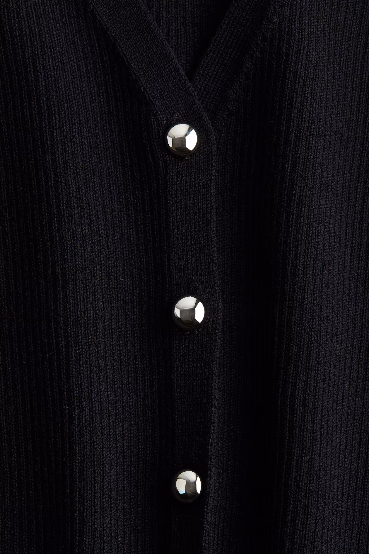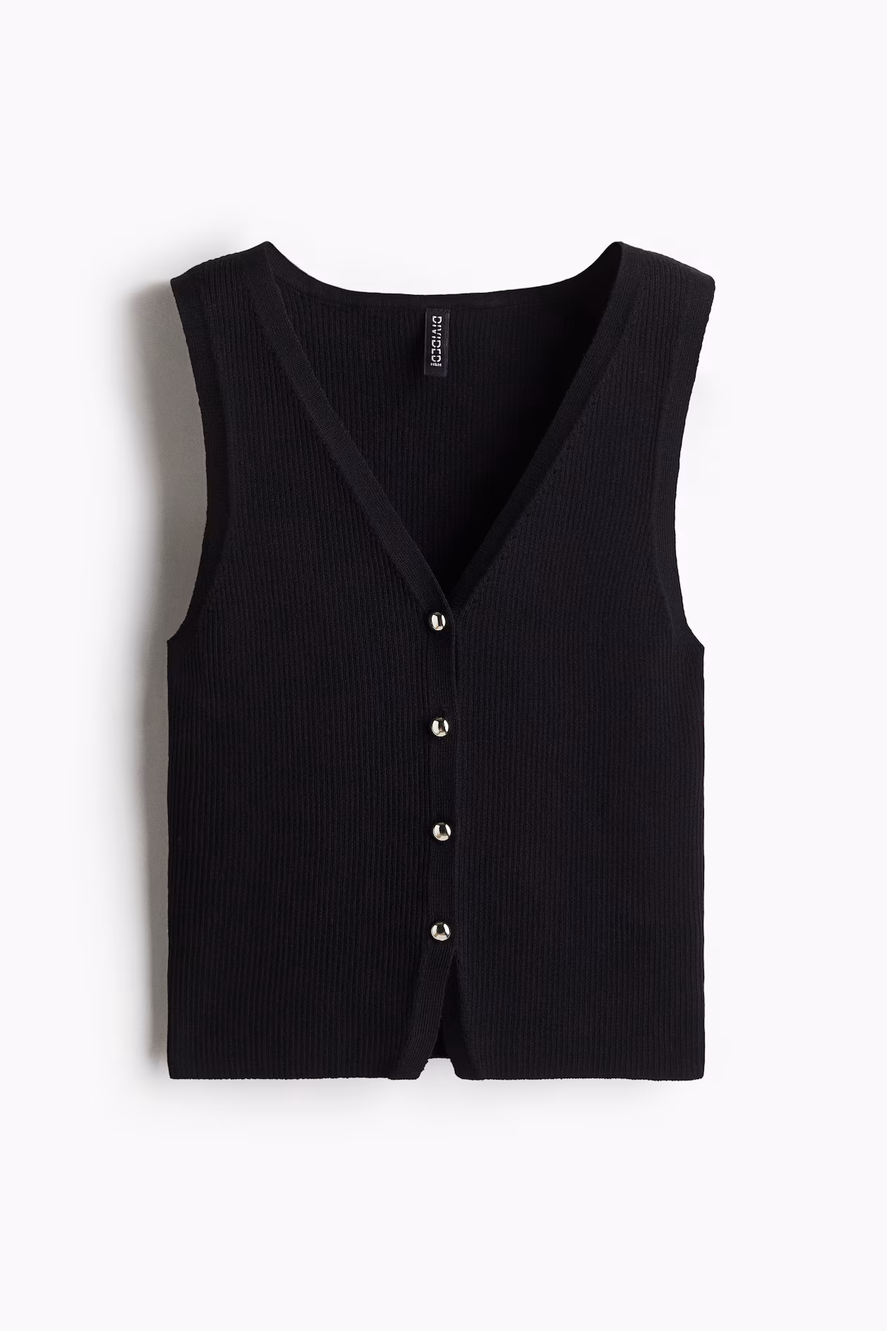 Soft, fine-knit sweater vest. V-neck and shiny metal buttons at front.