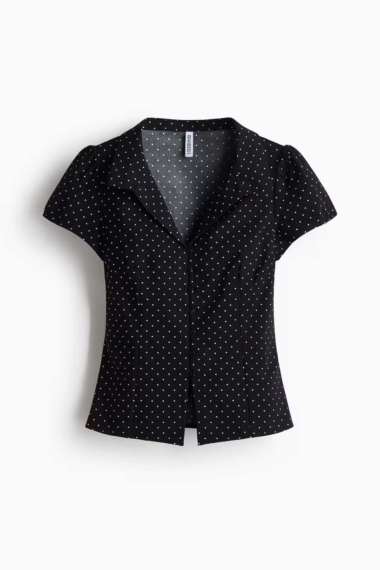 Fitted top in crêpe jersey with shaping seams at front and back. Open collar, buttons from neckline to waist, and short puff sleeves with gathered, elasticized cuffs.