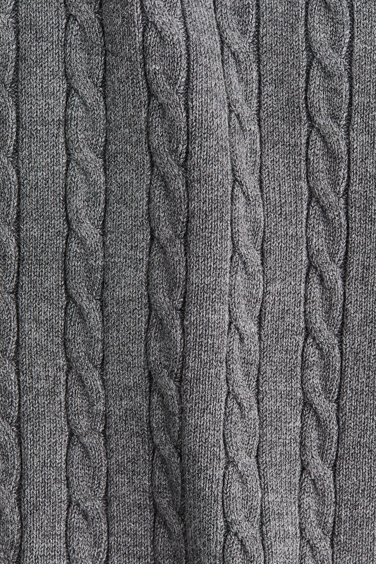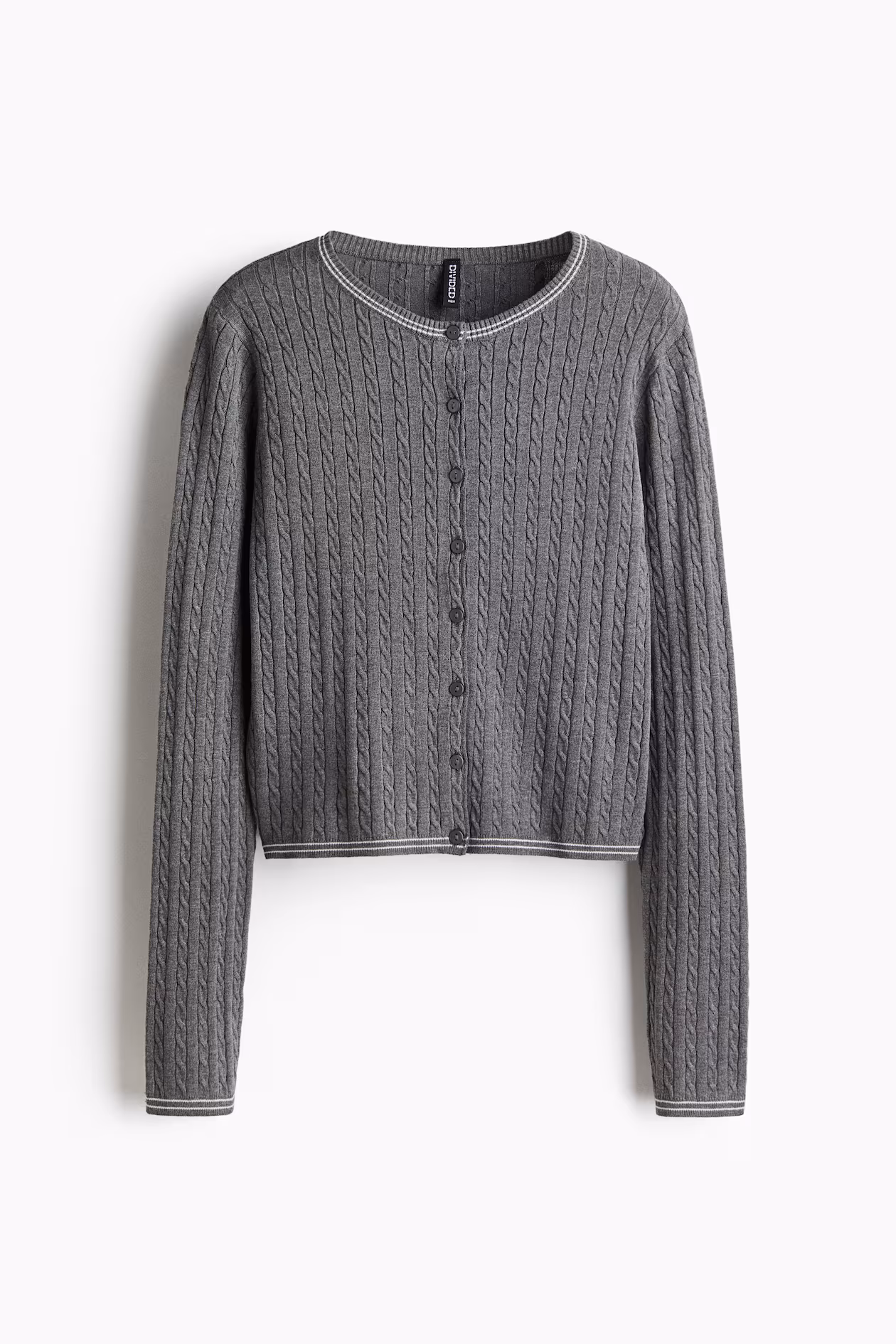 Short, fitted cardigan in a soft cable knit. Round neckline, buttons at front, and long sleeves. Ribbed accent-colored stripes at neckline, cuffs, and hem.