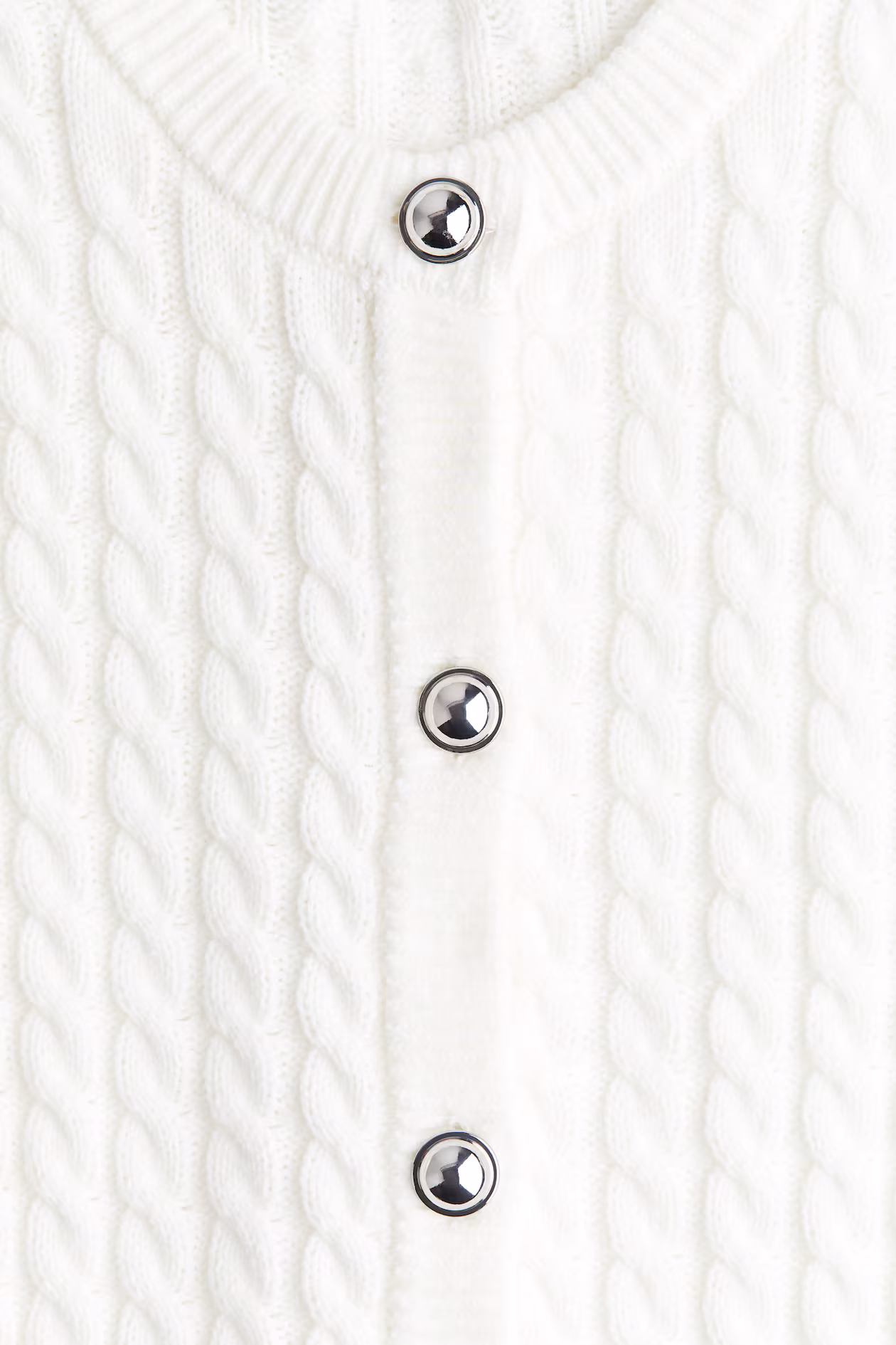 Short, fitted cardigan in a soft, cotton-blend cable knit. Round neckline, metal buttons at front, and short sleeves. Ribbing at neckline, placket, cuffs, and hem.
