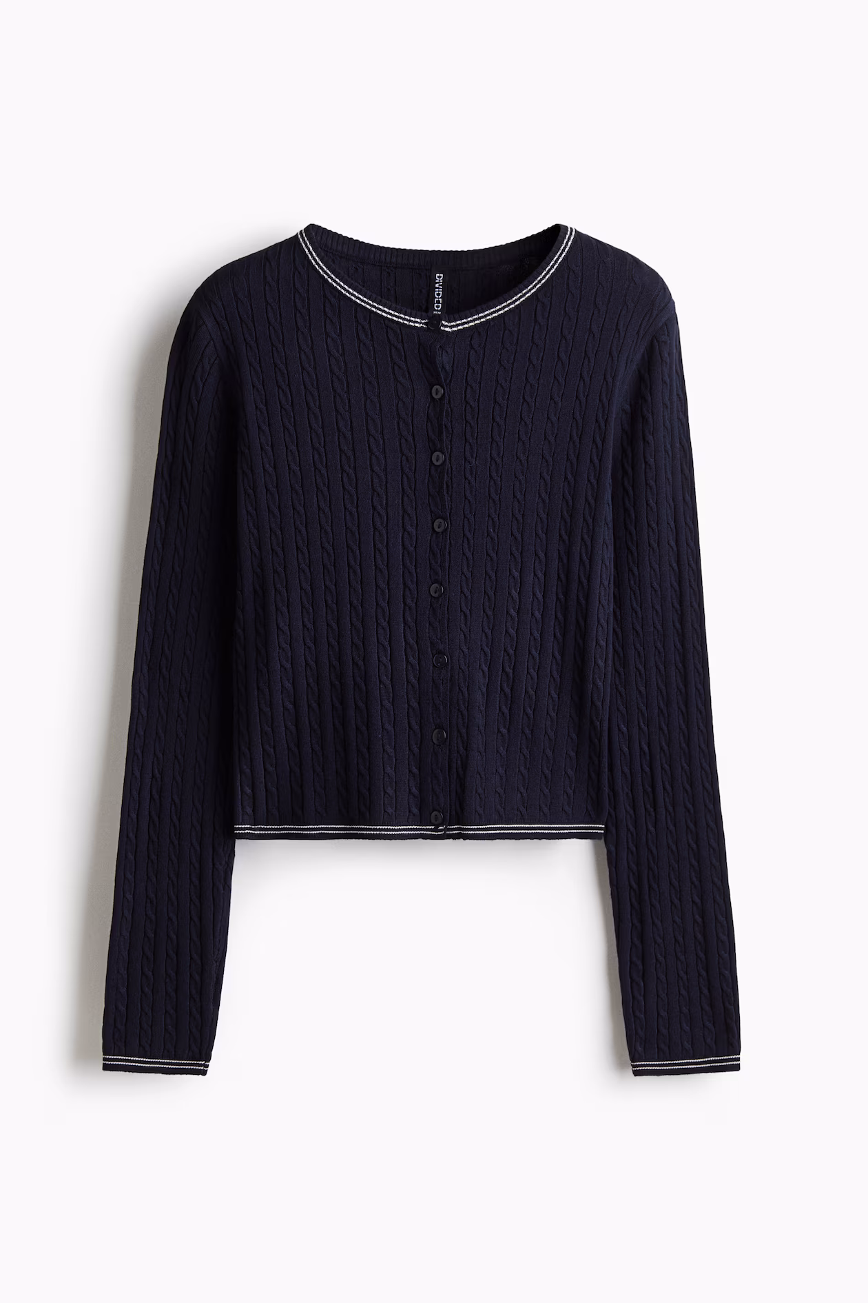 Short, fitted cardigan in a soft cable knit. Round neckline, buttons at front, and long sleeves. Ribbed accent-colored stripes at neckline, cuffs, and hem.