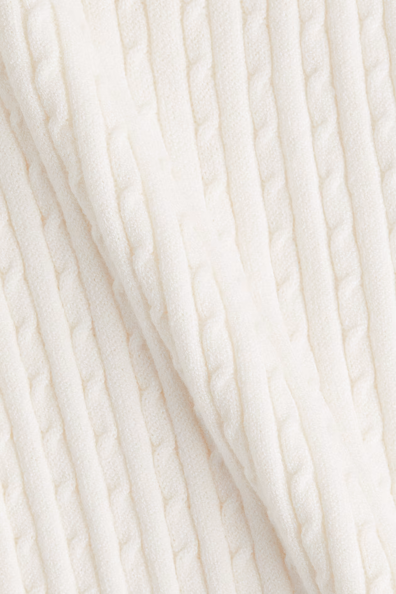 Soft, cable-knit pants. Elasticized, scalloped-edge waistband, and flared legs.