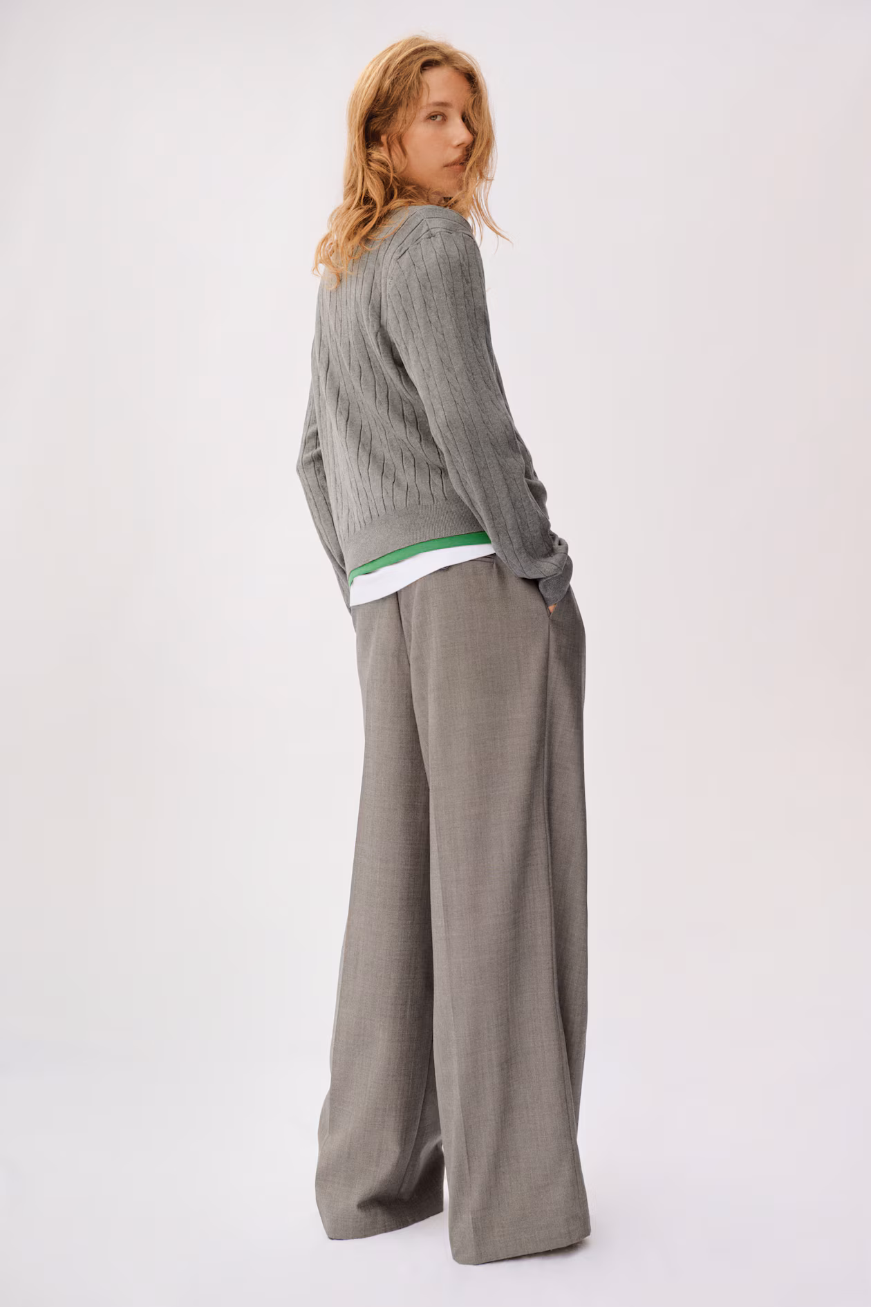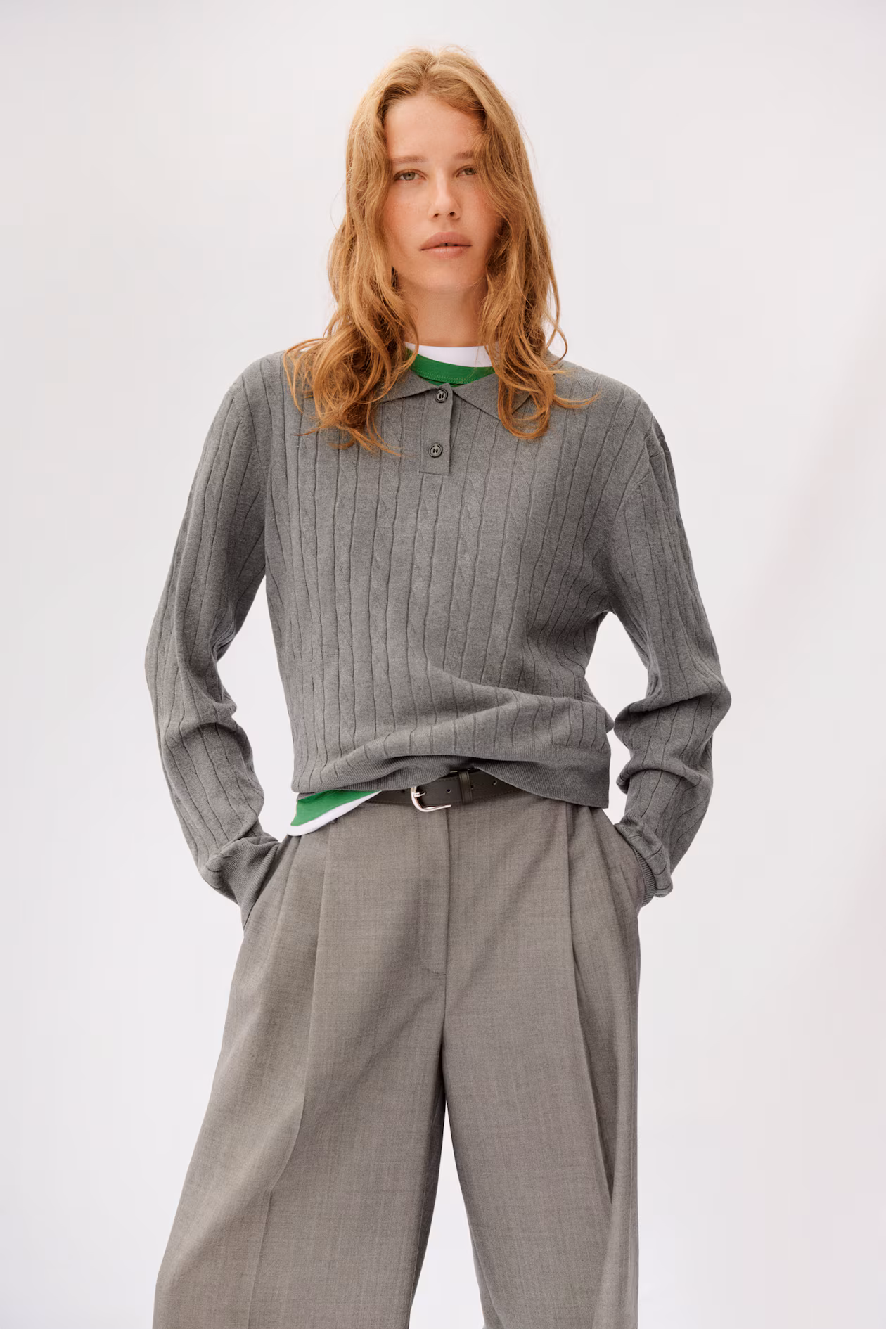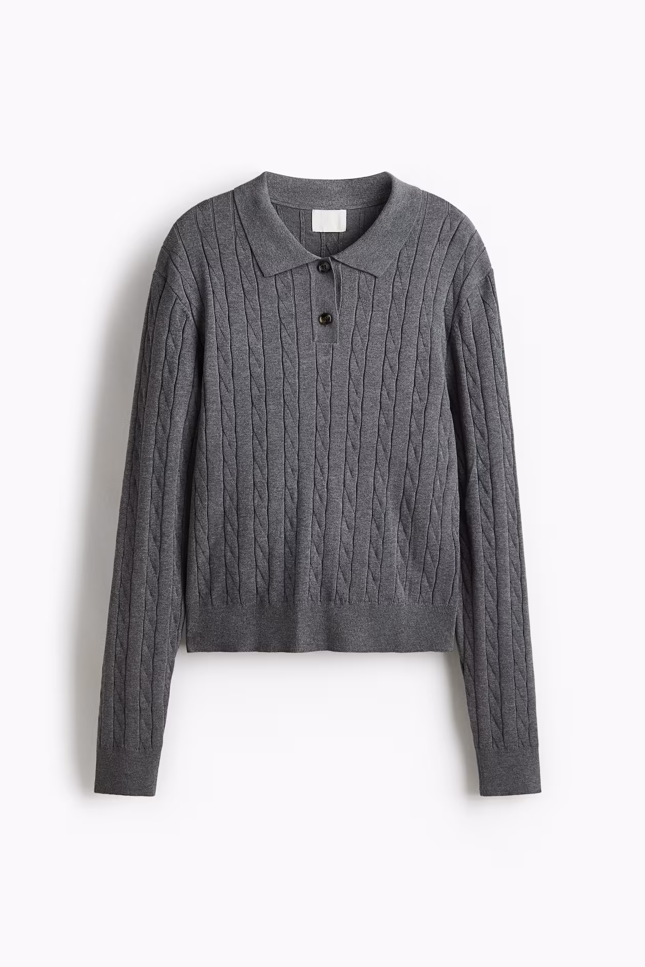 Polo shirt in a soft cable knit. Collar, short button placket, and long sleeves. Ribbing at cuffs and hem.
