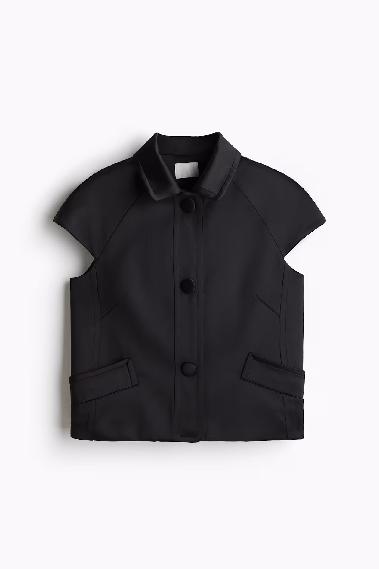 Short, fitted jacket in woven fabric. Collar, covered snap fasteners at front, raglan cap sleeves, and diagonal front pockets. Lined.