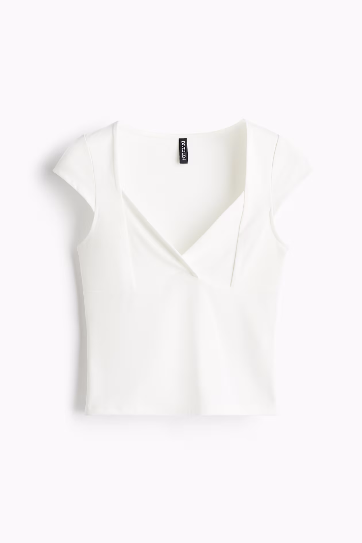 Short, fitted top in heavy interlock jersey. Low-cut sweetheart neckline, cap sleeves, and shaping seams at front for a flattering silhouette.