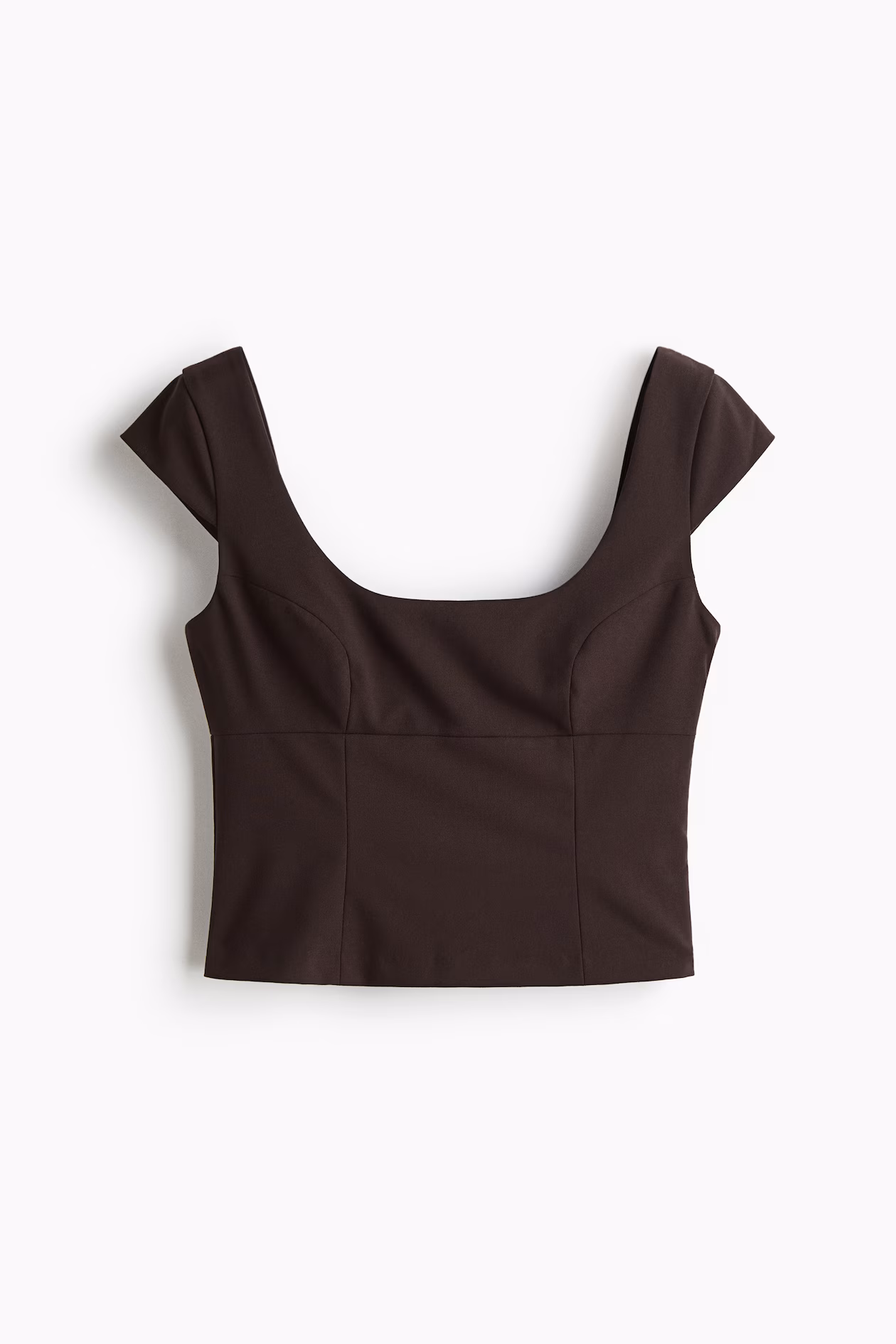 Short, fitted top in woven fabric. Low-cut square neckline at front and back, shaping seams at front and back, and cap sleeves. Partly lined.