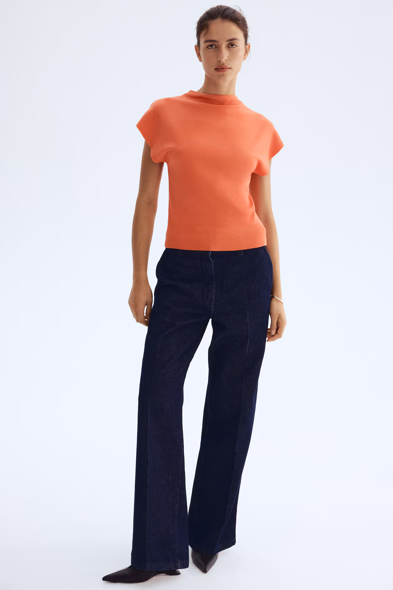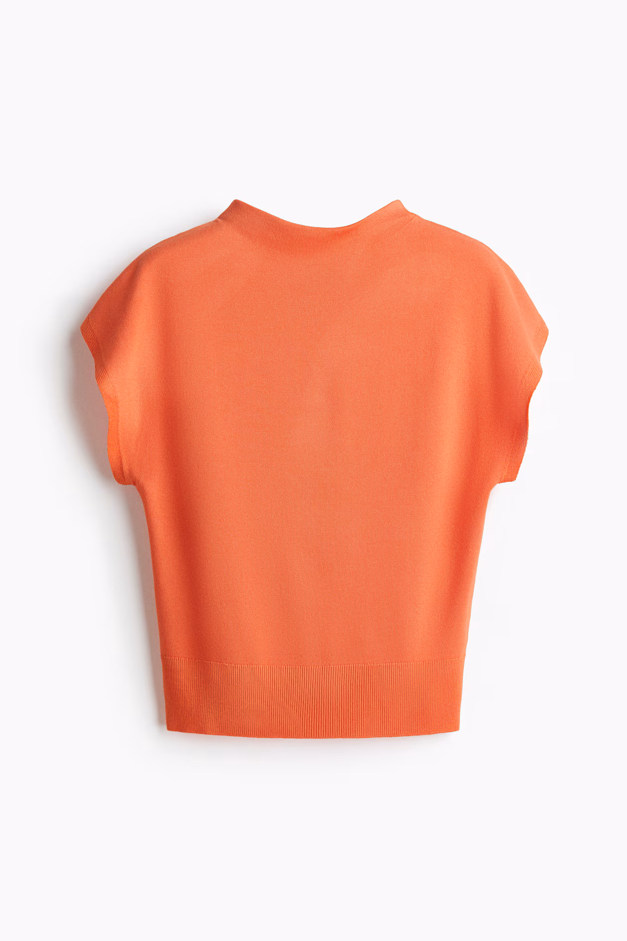 Top in a fine, dense knit. Low stand-up collar, cap sleeves, and ribbing at hem.