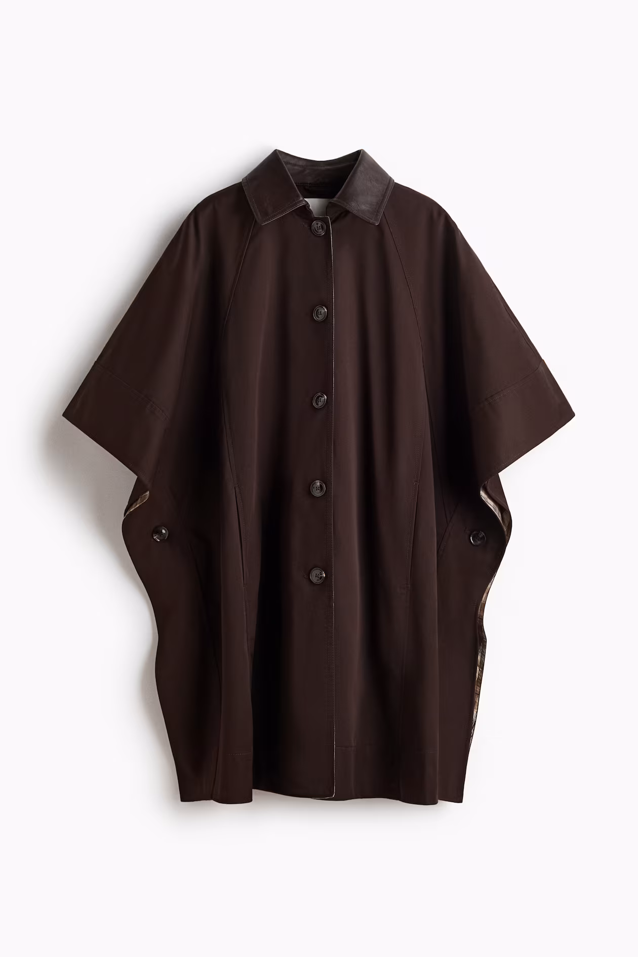 Oversized, knee-length coat in twill with a collar in coated fabric. Buttons at front, discreet side pockets, inverted box pleat at back for added volume, and open sides with a button. Cape sleeves. Partially lined.