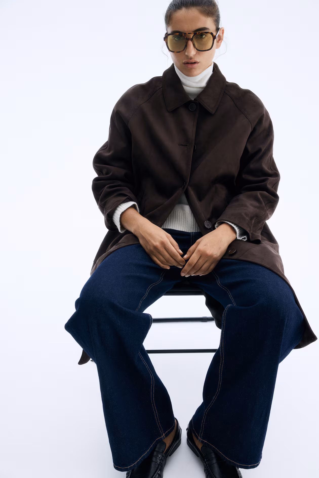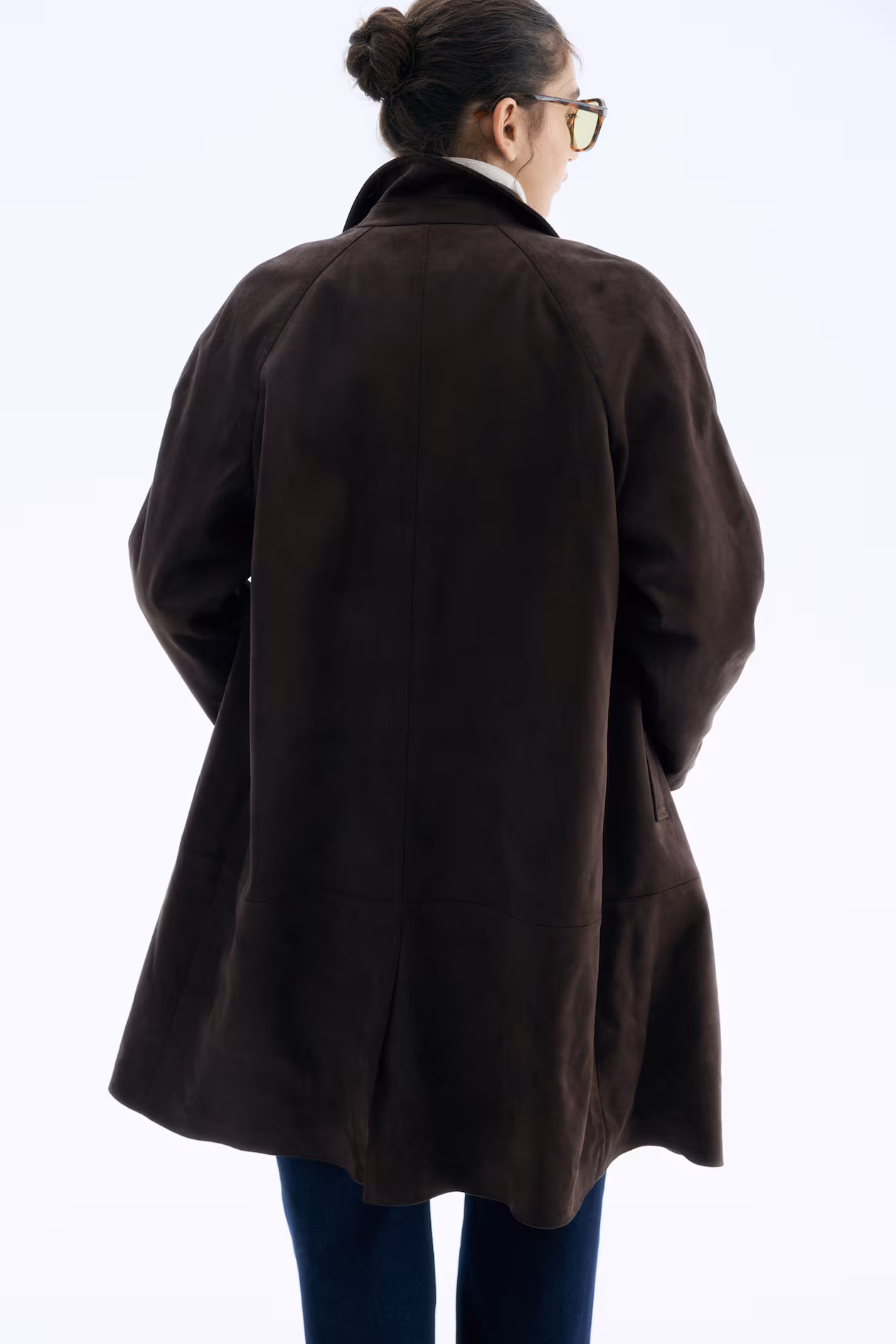 Knee-length coat in woven fabric with a soft, napped finish. Collar, buttons at front, welt side pockets, and raglan sleeves. Vent at back. Lined.