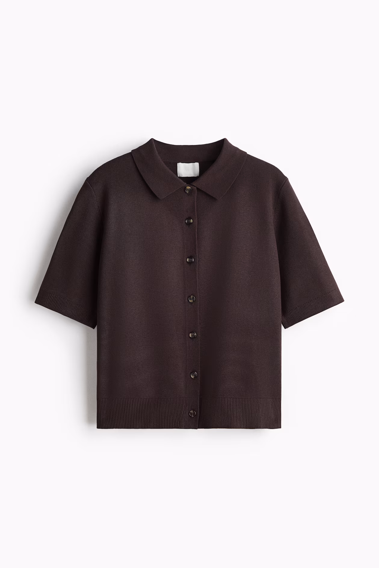 Short, fine-knit cardigan. Collar, buttons at front, and short sleeves. Ribbing at cuffs and hem.