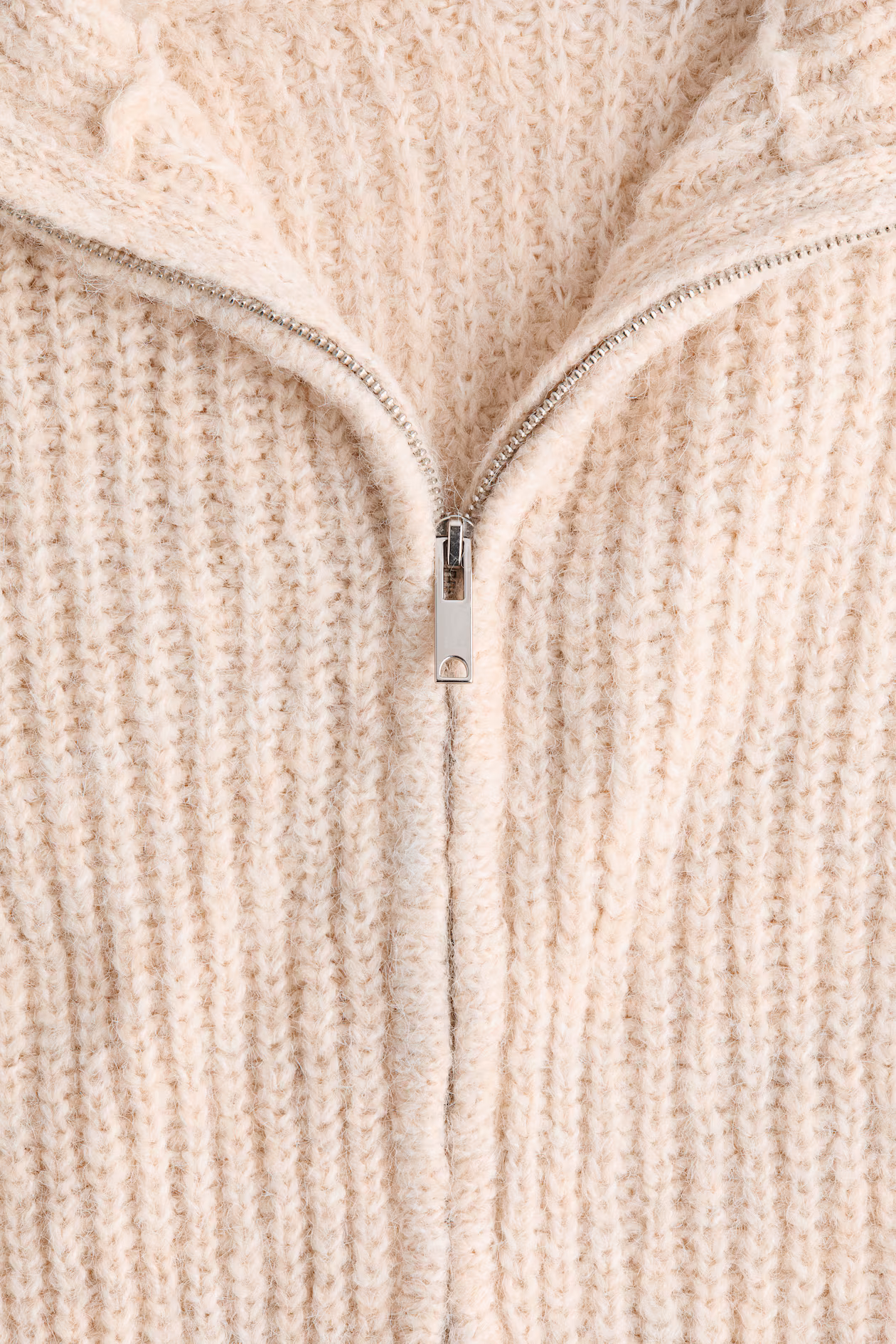 Cardigan in a soft rib knit. High collar, concealed zipper at front, and back-facing shoulder seams. Dropped shoulders and long sleeves.