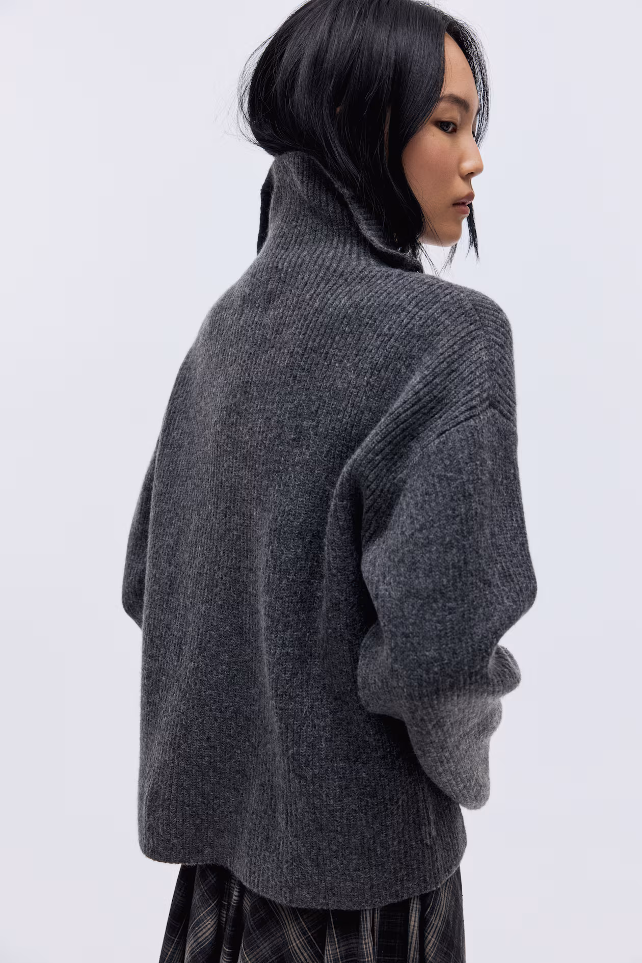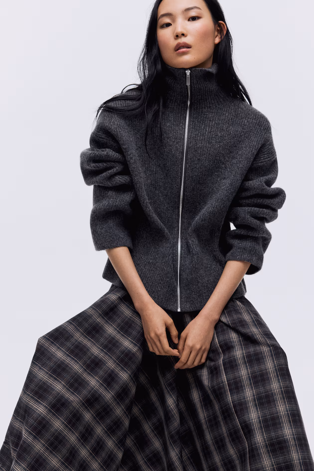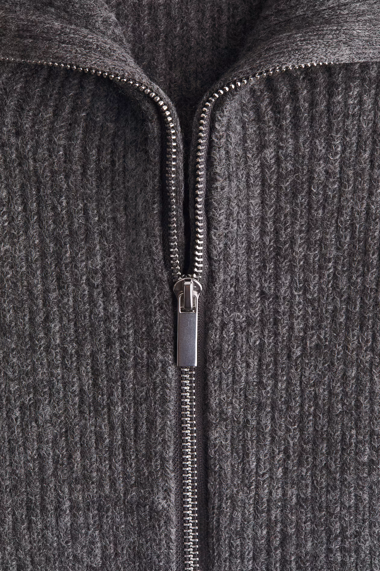 Soft, rib-knit cardigan. Stand-up collar, zipper at front, and dropped shoulders.