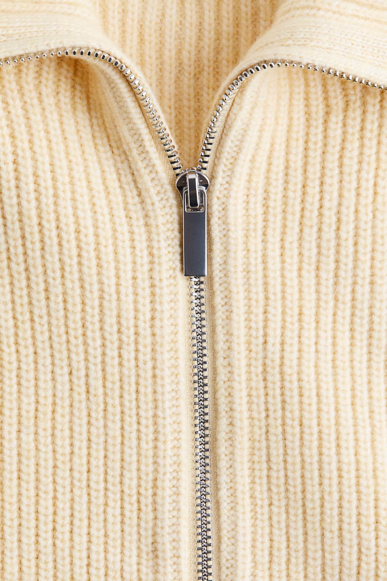 Soft, rib-knit cardigan. Stand-up collar, zipper at front, and dropped shoulders.