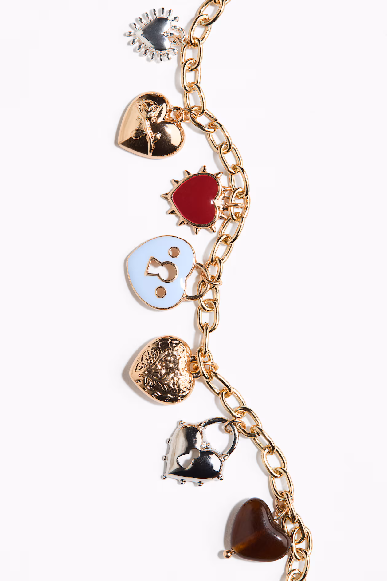 Bracelet in metal chain with charms in various designs. Adjustable length with trigger clasp.