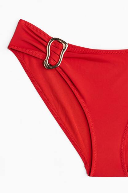 Fully lined bikini bottoms. Mid-rise waist with a metal detail at one side. Cutaway coverage at back.