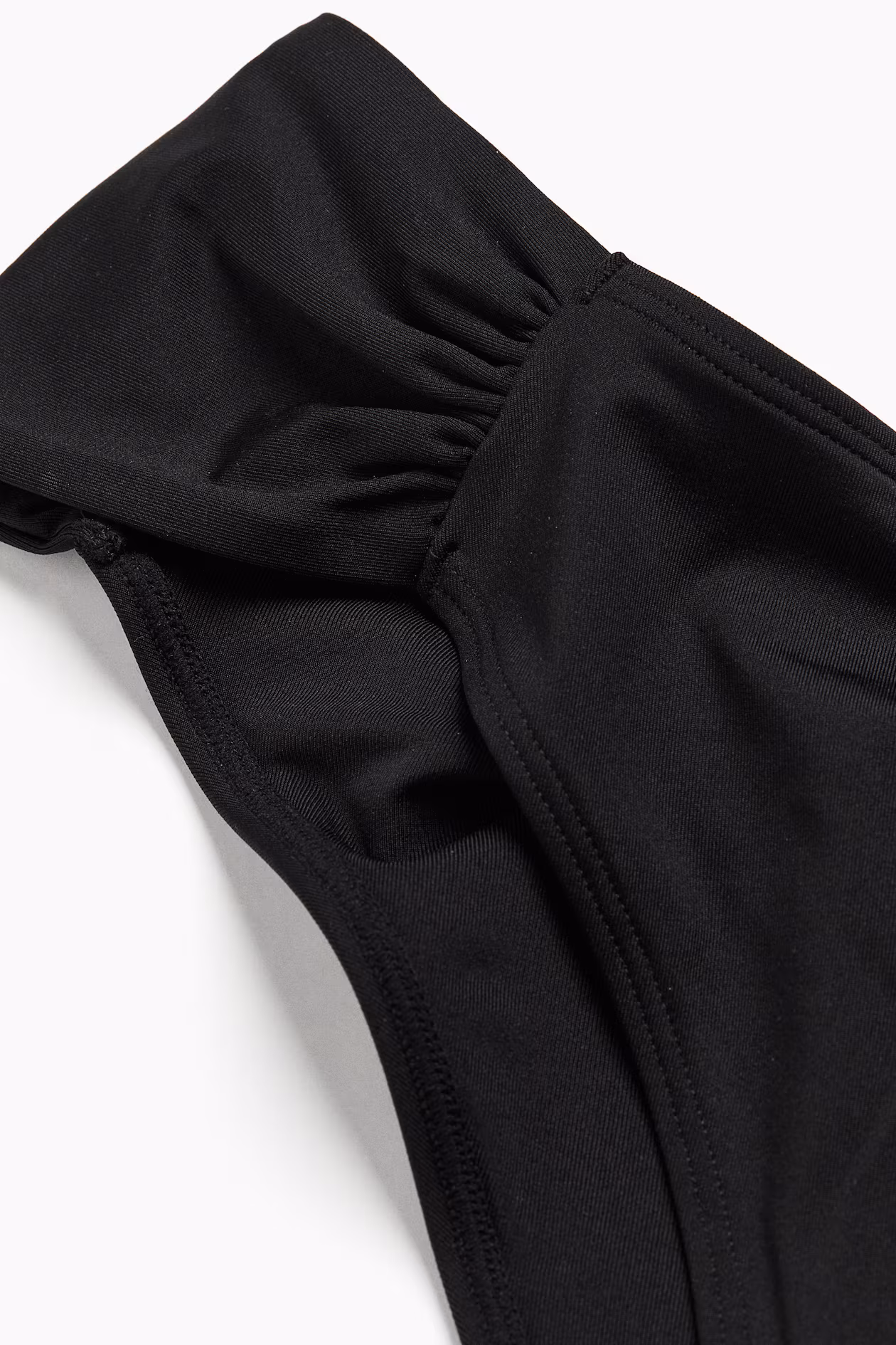 Fully lined bikini bottoms. Mid-rise waist, gathered strap at sides, and cutaway coverage at back.