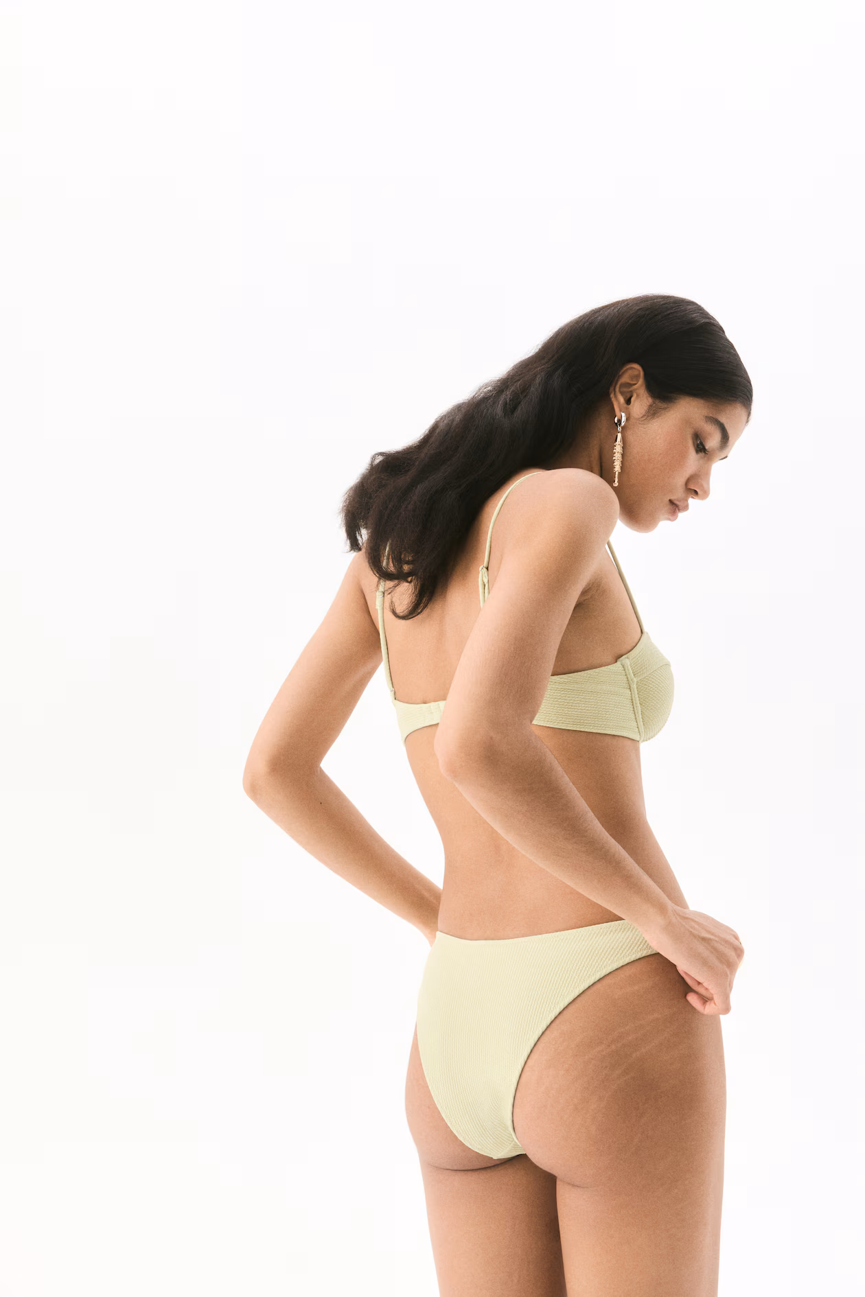 Fully lined bikini bottoms with a low, curved waist. Cutaway coverage at back.