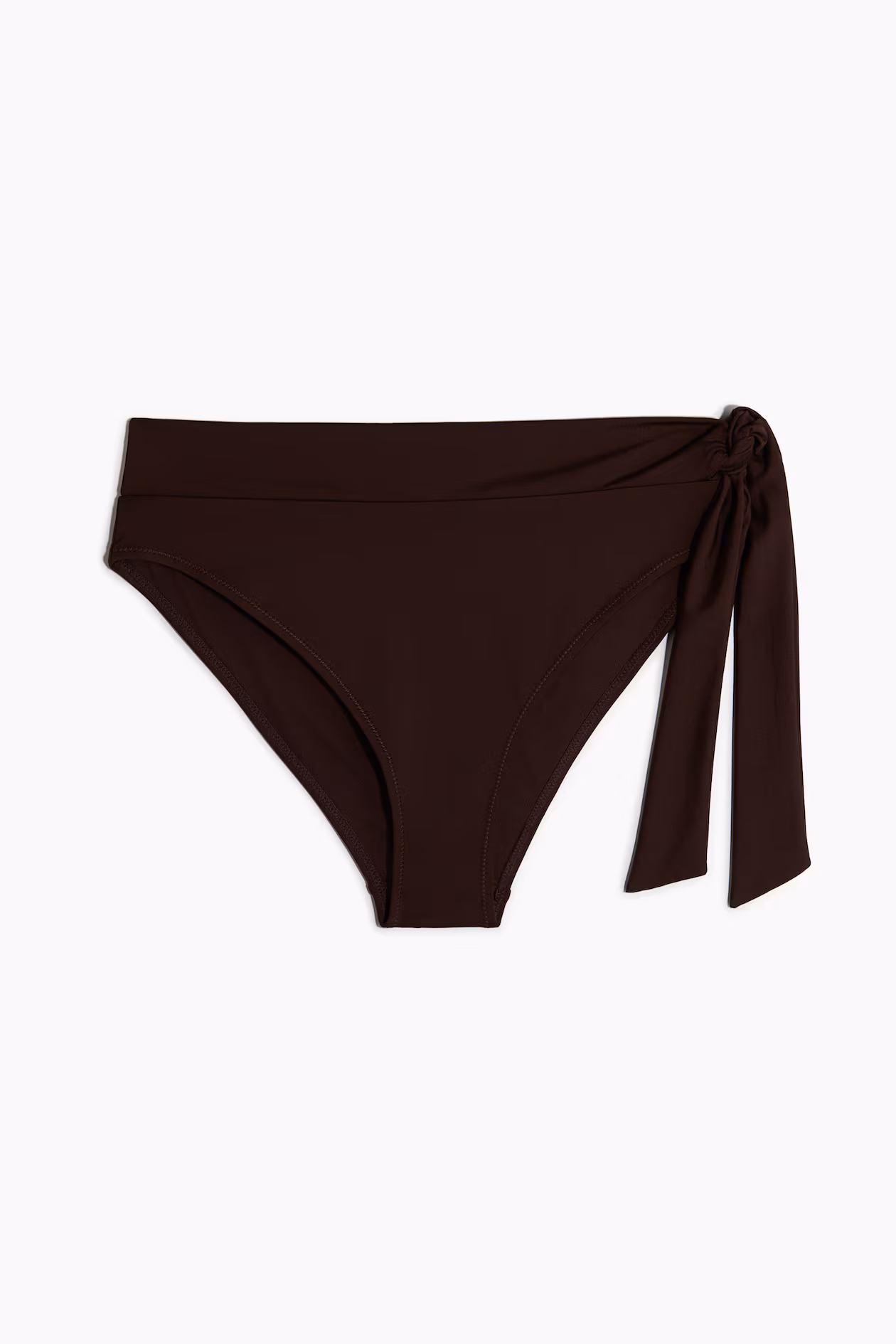 Fully lined bikini bottoms. High waist, wide decorative ties at one side, and cutaway coverage at back.