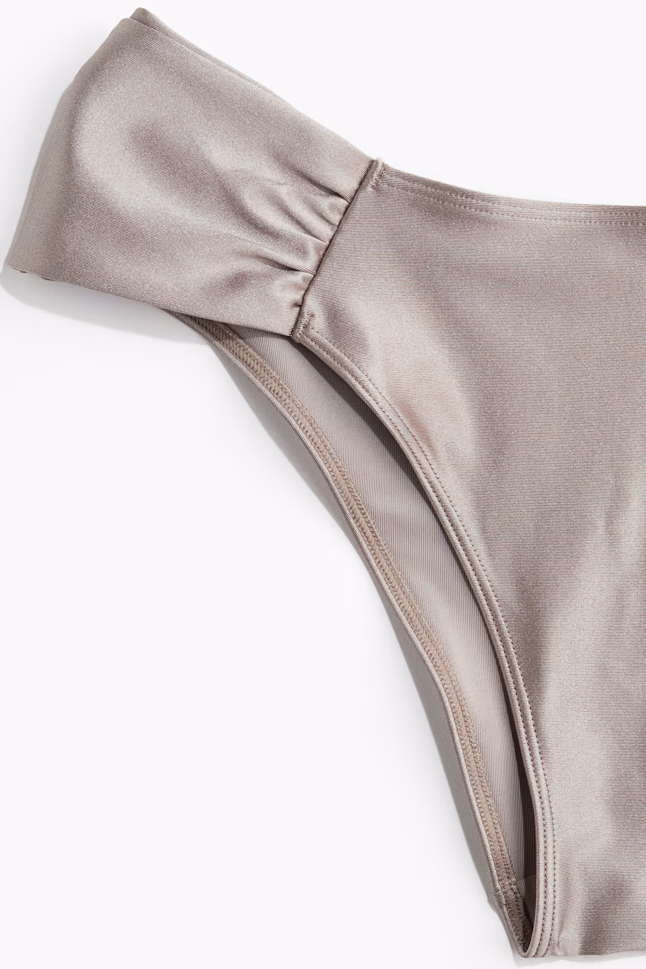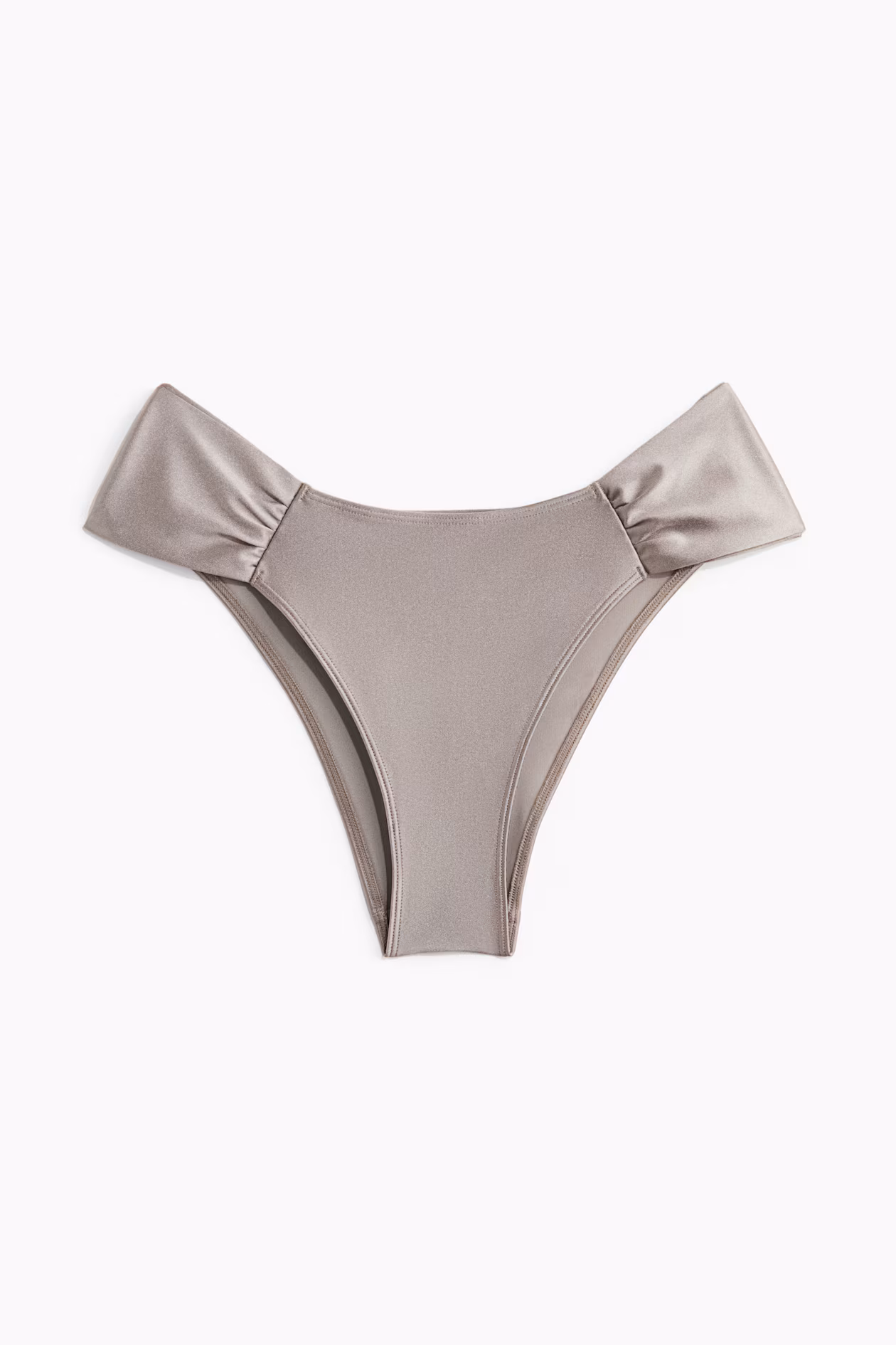 Fully lined bikini bottoms with wide, gathered sides. Mid-rise waist and cutaway coverage at back.
