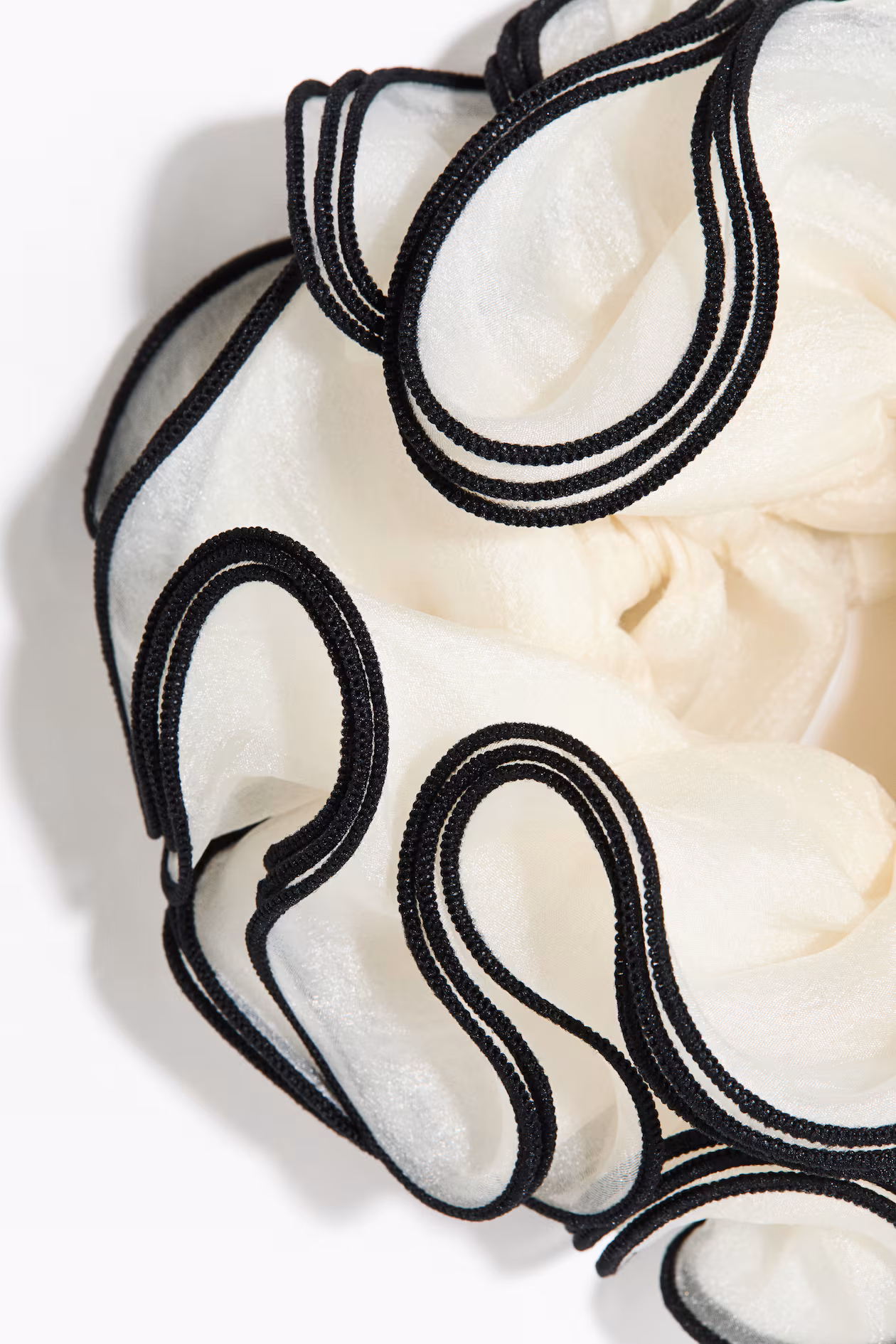 Scrunchie with multiple layers of sheer chiffon and accent-color overlocked trim.