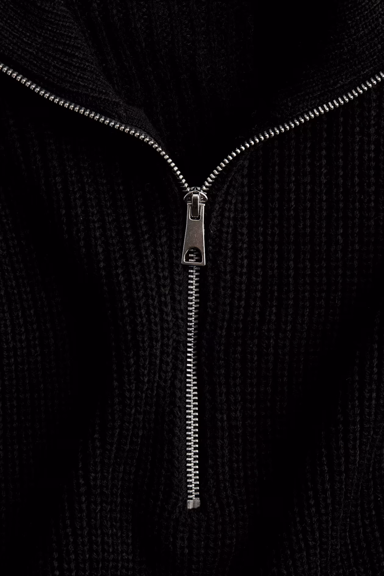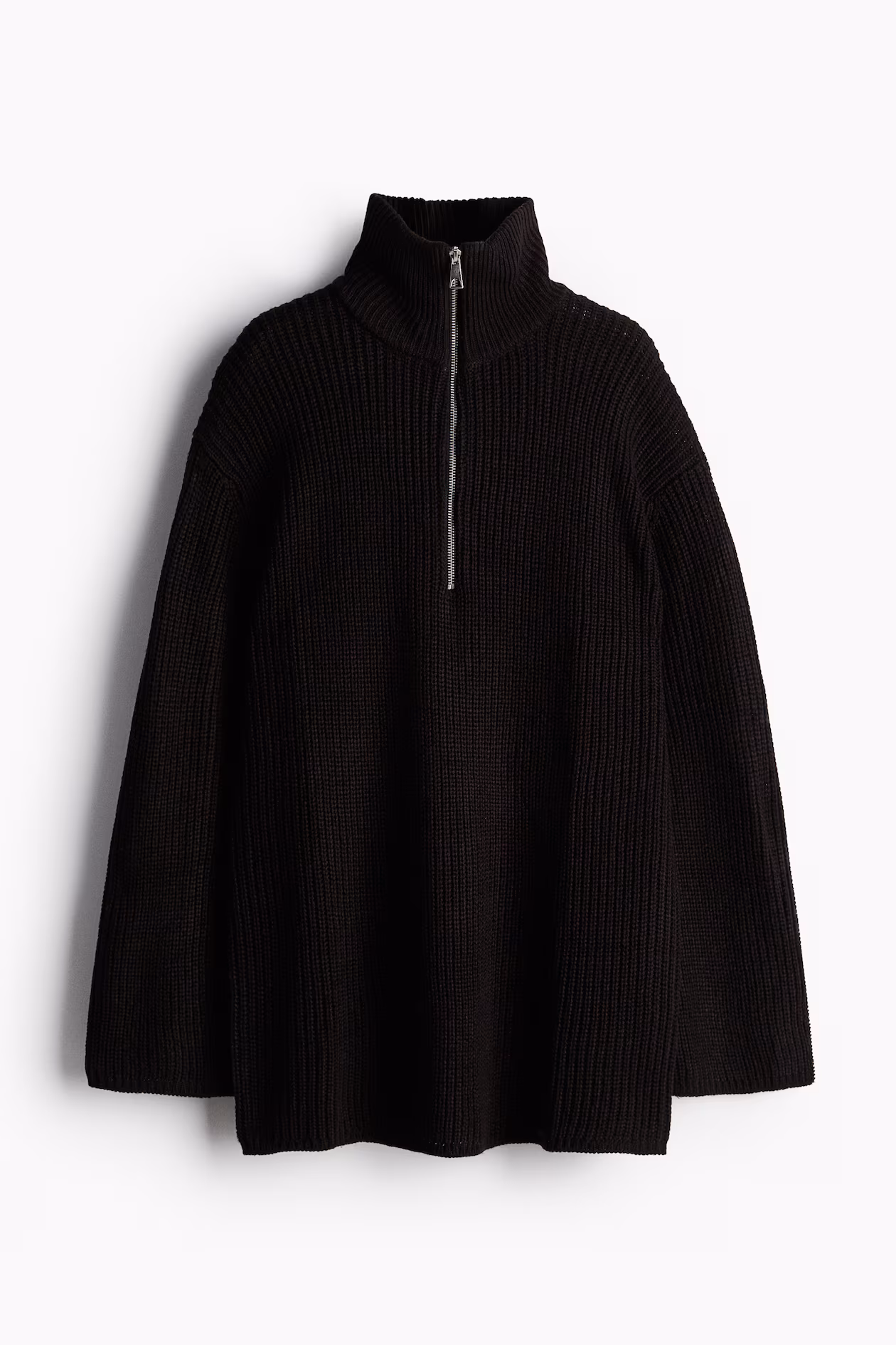 Slightly longer, loose-fit sweater in a soft, chunky knit. High, double-layered collar, half-zip, heavily dropped shoulders, and long sleeves. Narrow ribbing at collar, cuffs, and hem.