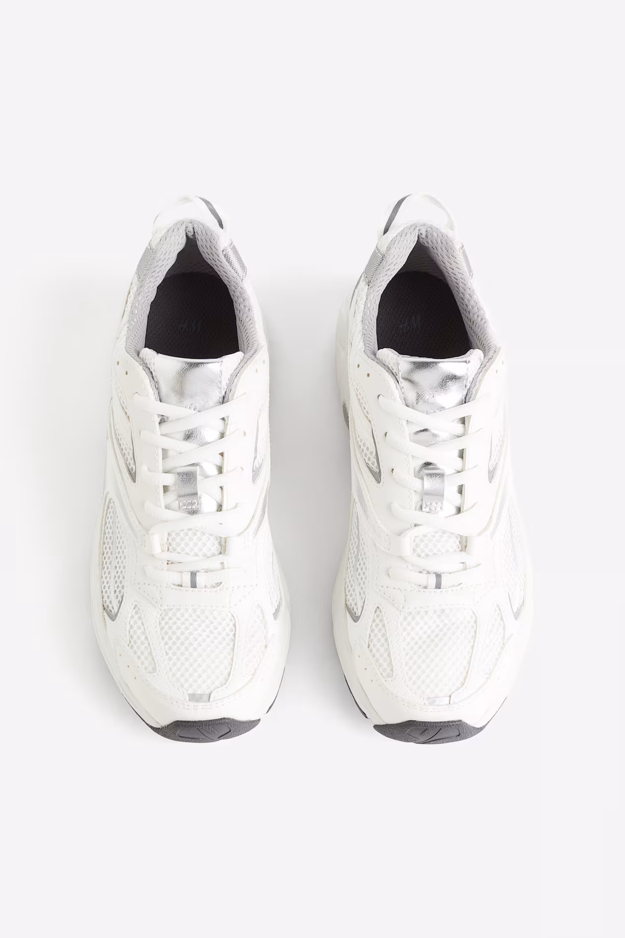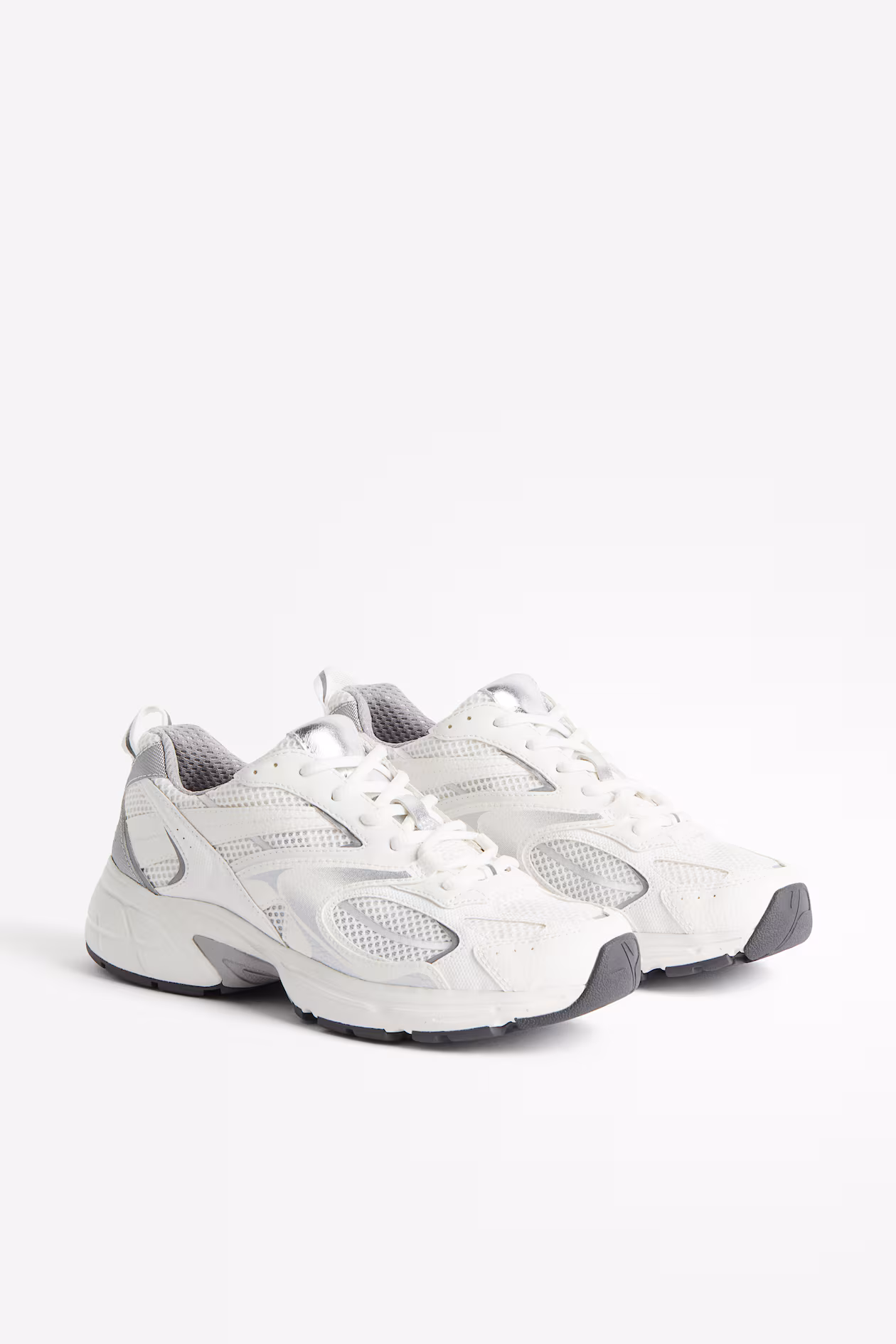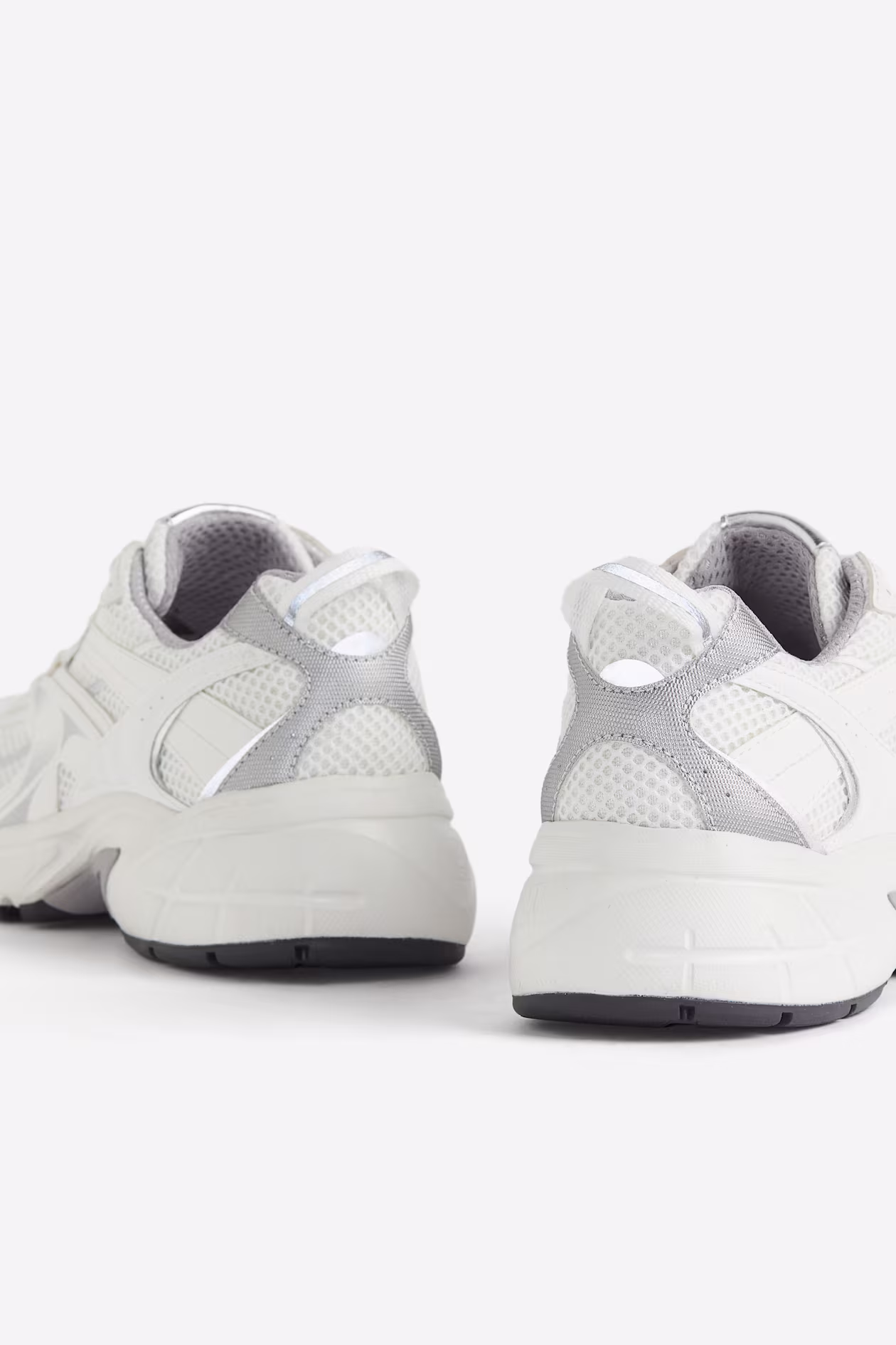 Sneakers in mesh and coated fabric with lacing at front and a loop at back. Mesh lining, mesh insoles, and chunky, patterned soles.