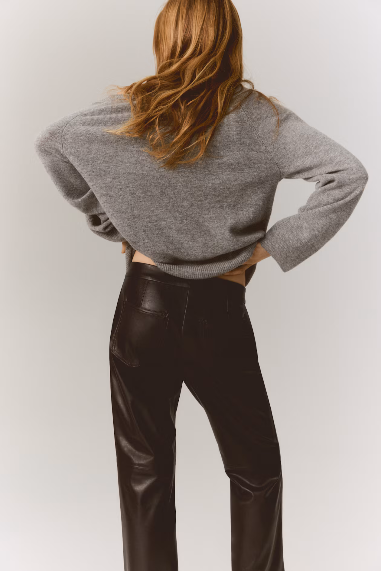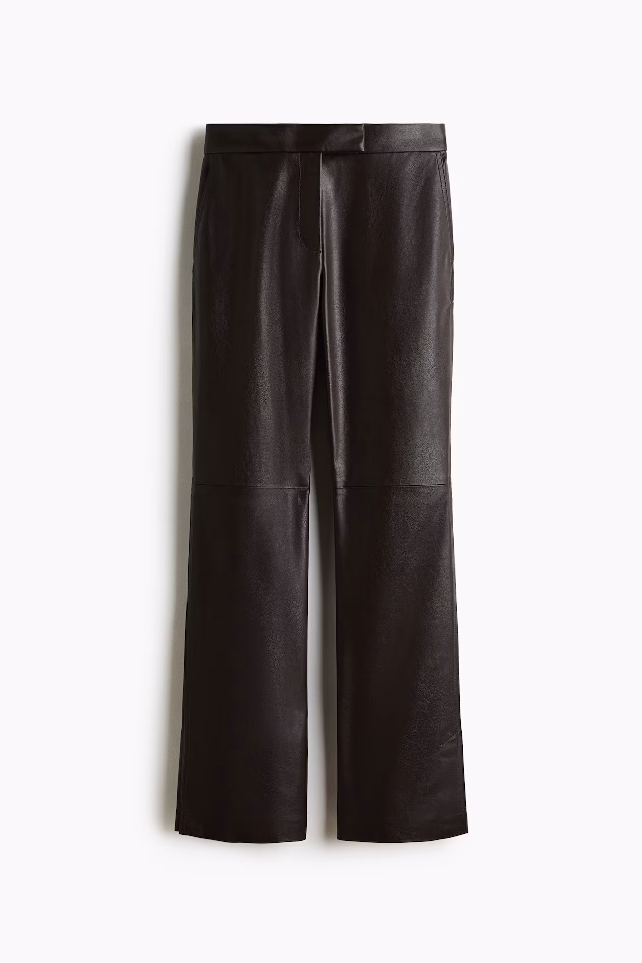Fitted pants in coated fabric. Extended waistband tab with concealed button and hook-and-bar fasteners, and zip fly. Side pockets, back pockets, and bootcut legs with a slit at hems.
