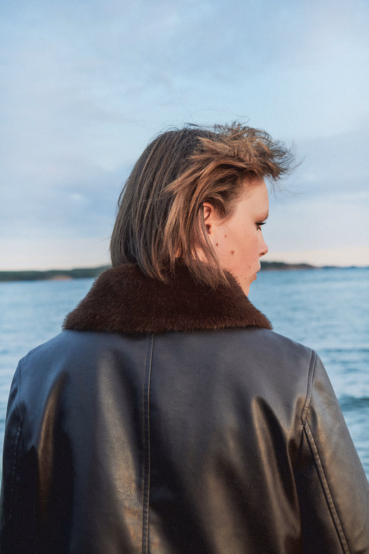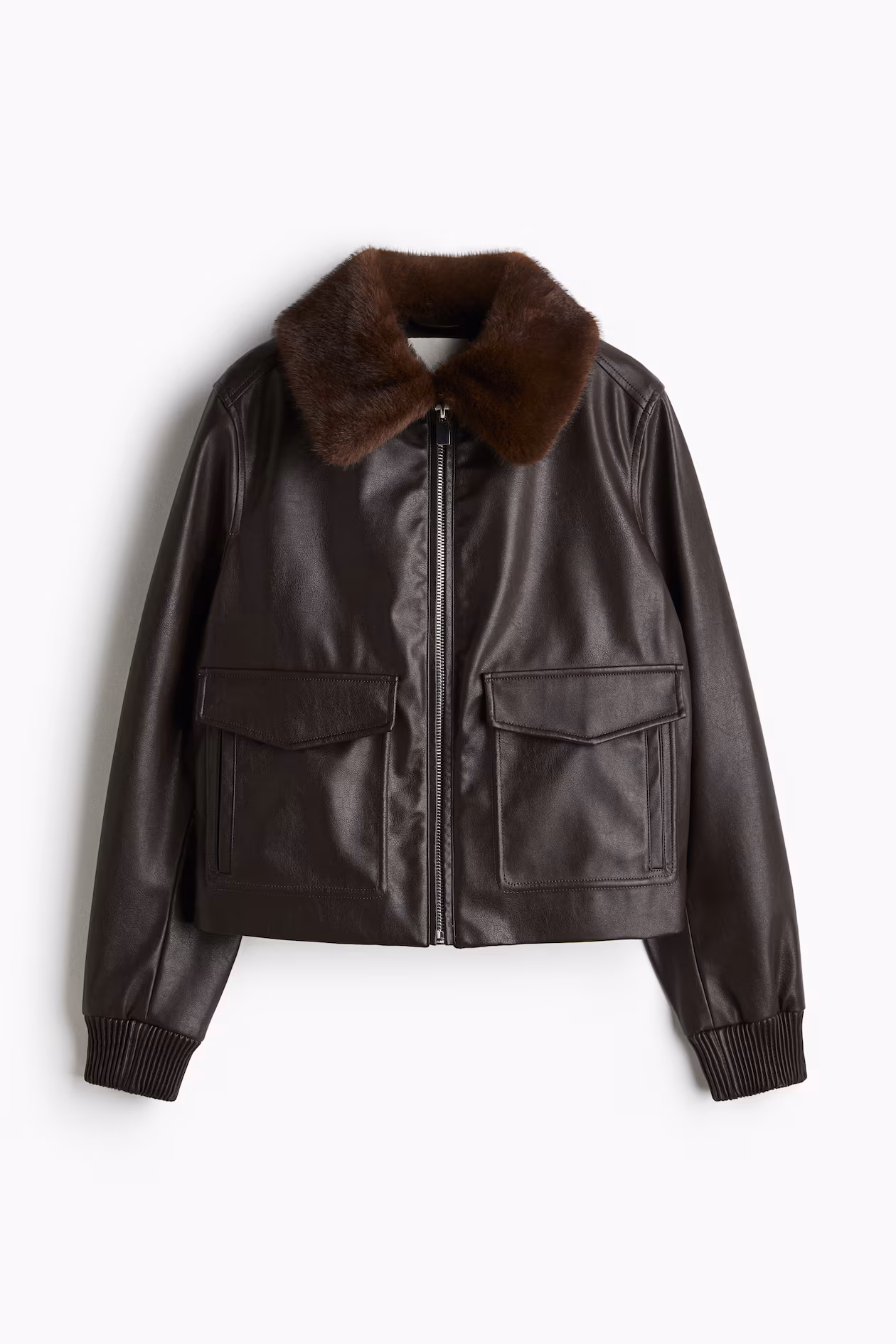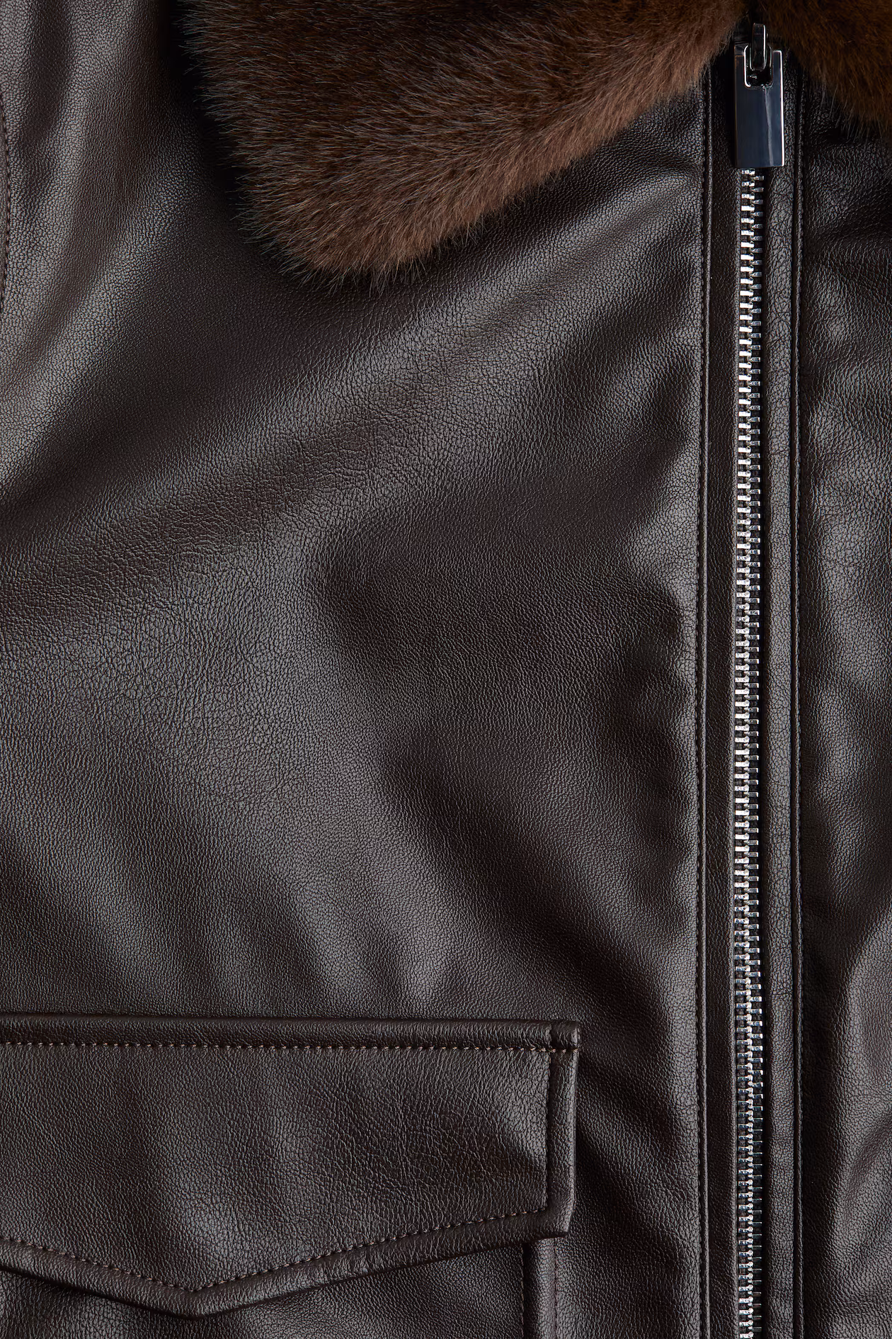 Short jacket in coated fabric with a soft, fluffy collar. Zipper at front, patch front pockets with flap and concealed snap fastener, and integrated side pockets. Ribbed cuffs. Lined.