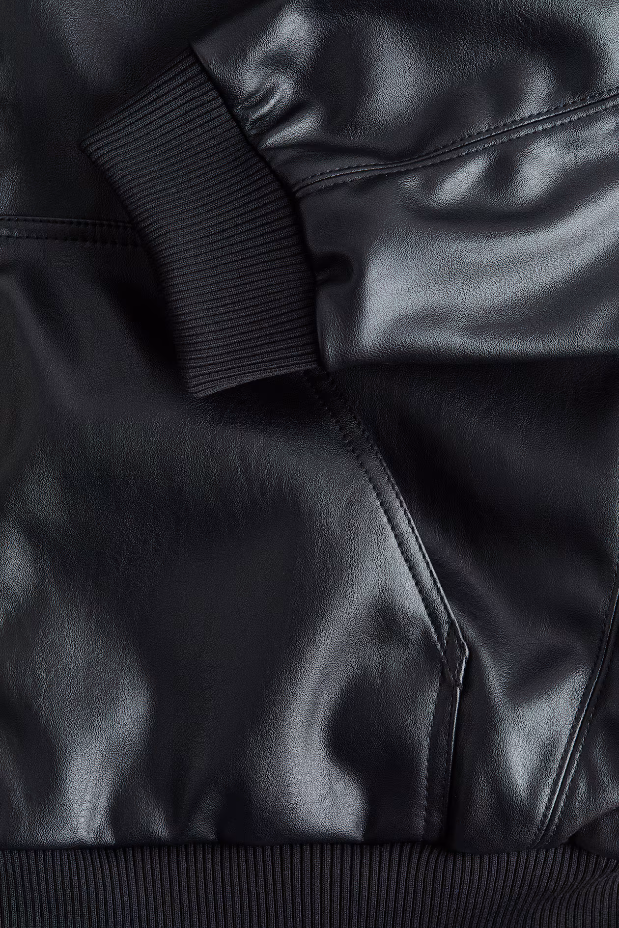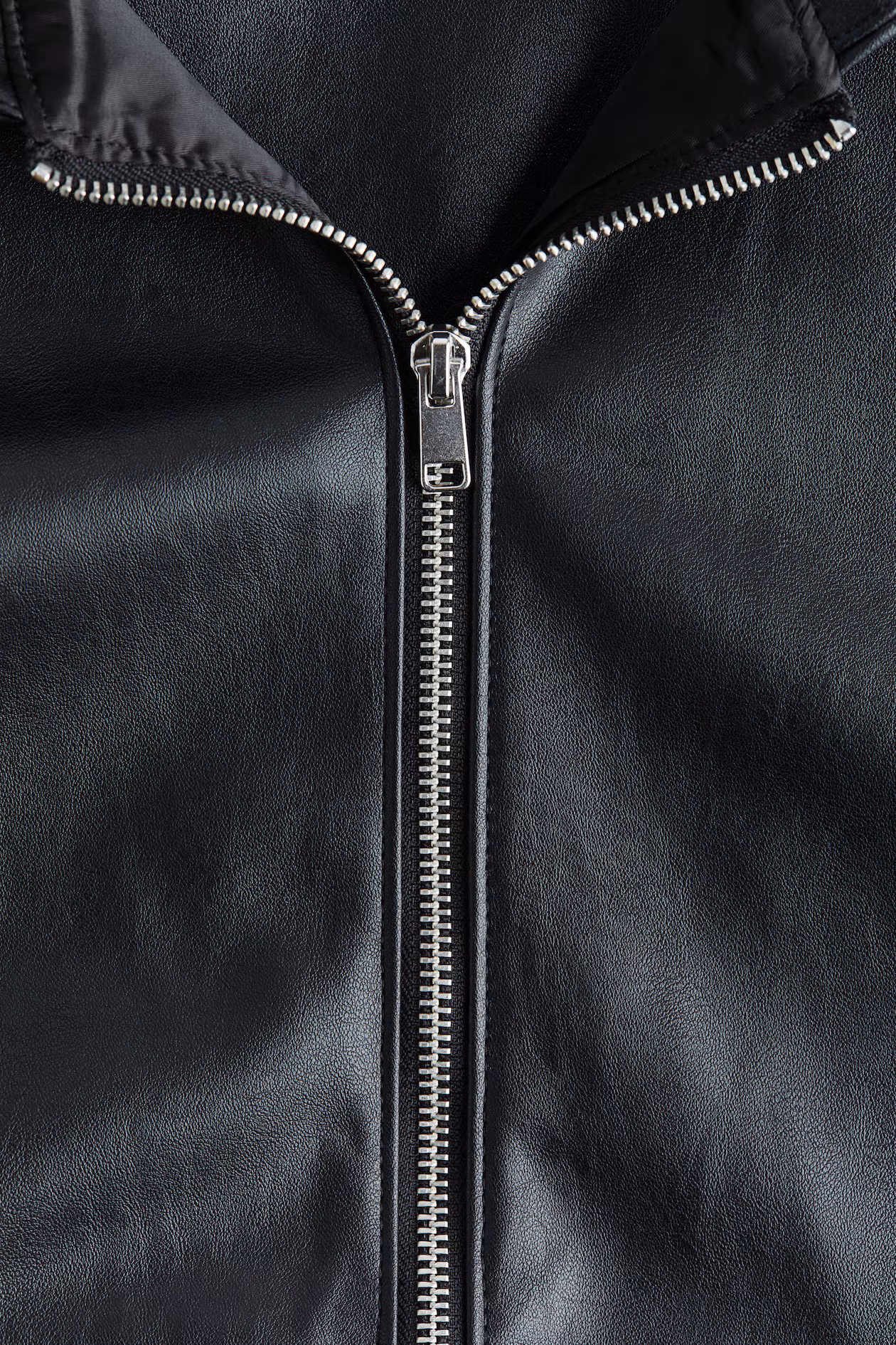 Oversized jacket in coated fabric with a hood. Zipper at front, front pockets, dropped shoulders, and long sleeves. Ribbing at cuffs and hem. Lined.