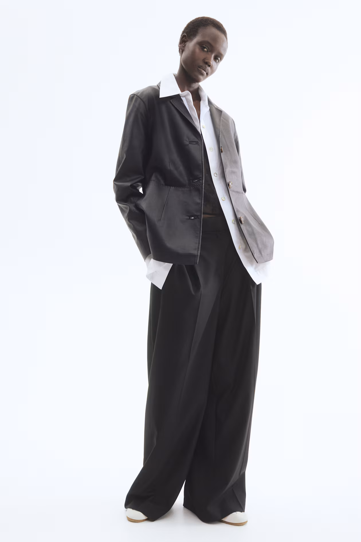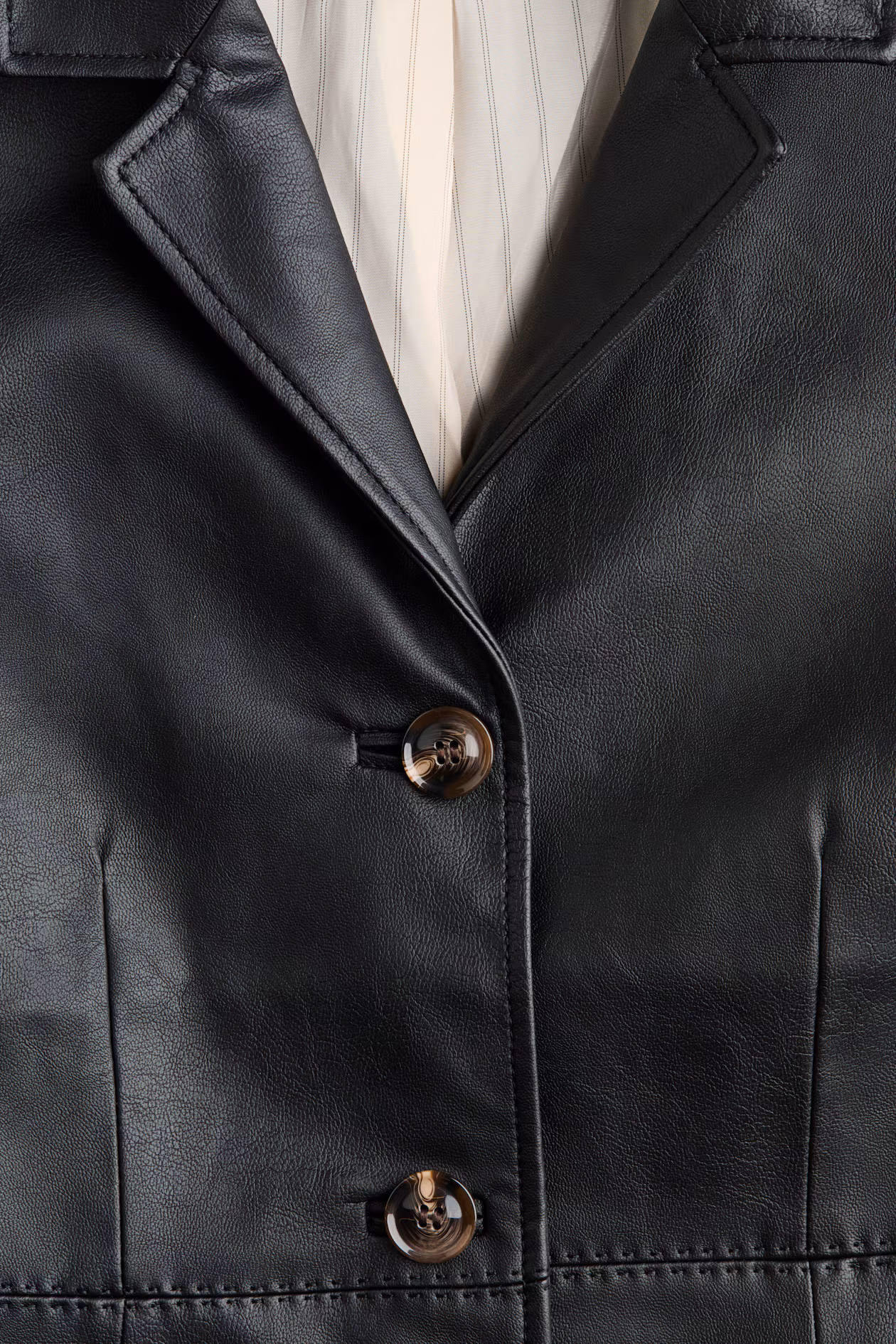 Fitted jacket in coated fabric with saddle stitching. Notched lapels, buttons at front, and discreet side pockets. Lined.