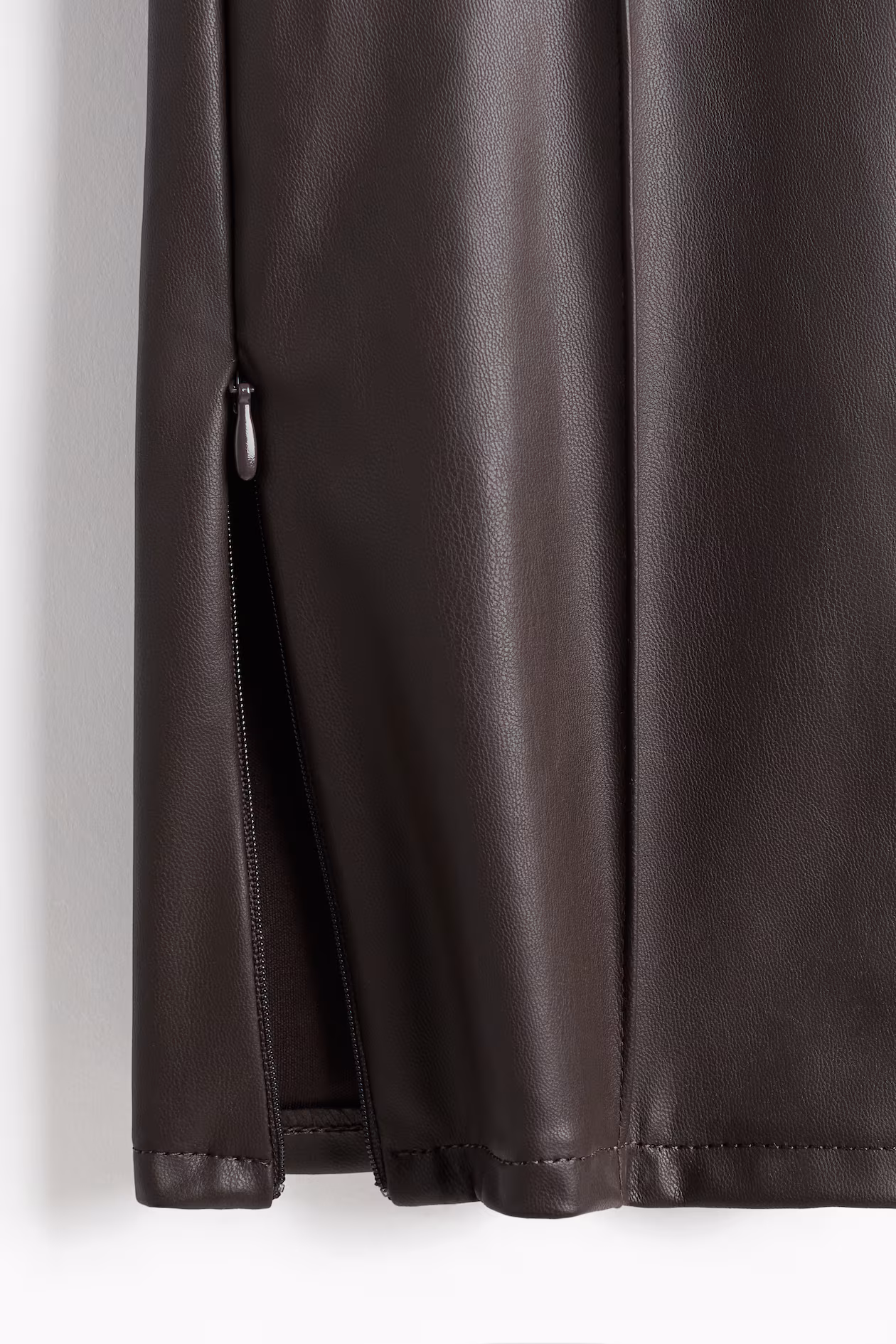 Leggings in coated fabric. Concealed, elasticized waistband, stitched creases at front of legs, and a concealed zipper at hems.