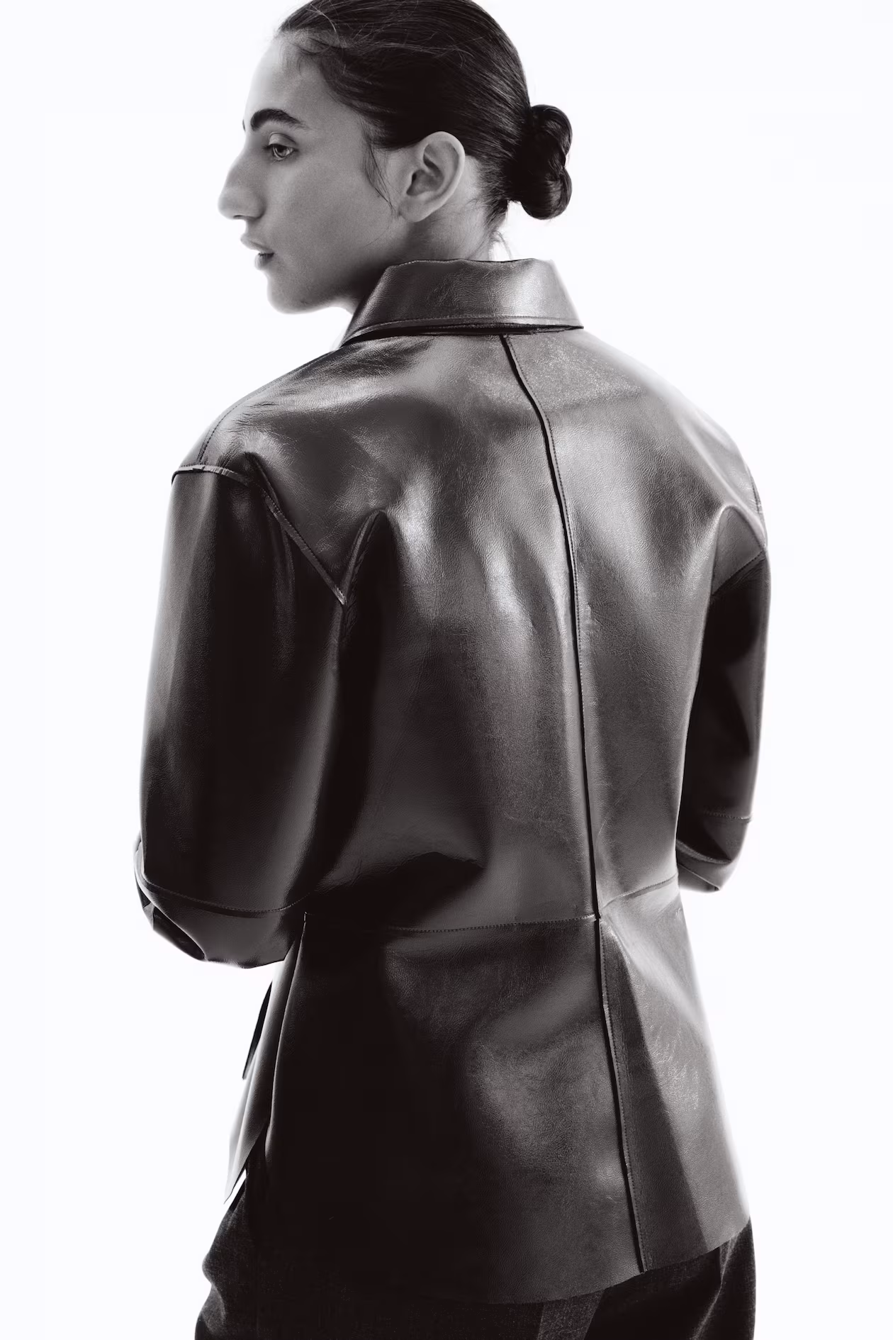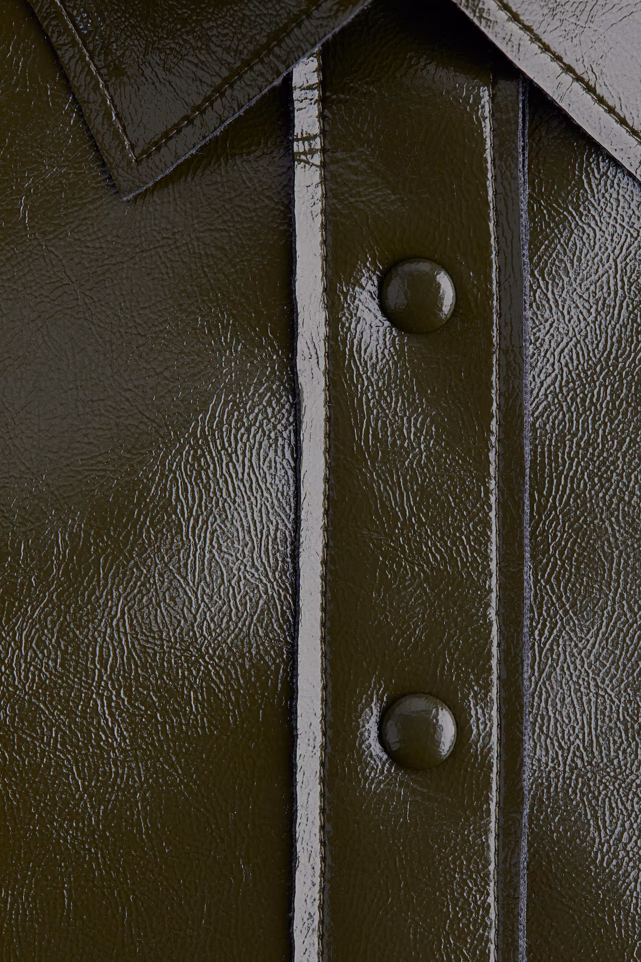Shirt in coated fabric with visible seams and raw edges throughout the design. Collar, covered buttons at front, gently dropped shoulders, and long sleeves with a sleeve placket and button at cuffs. Curved hem.