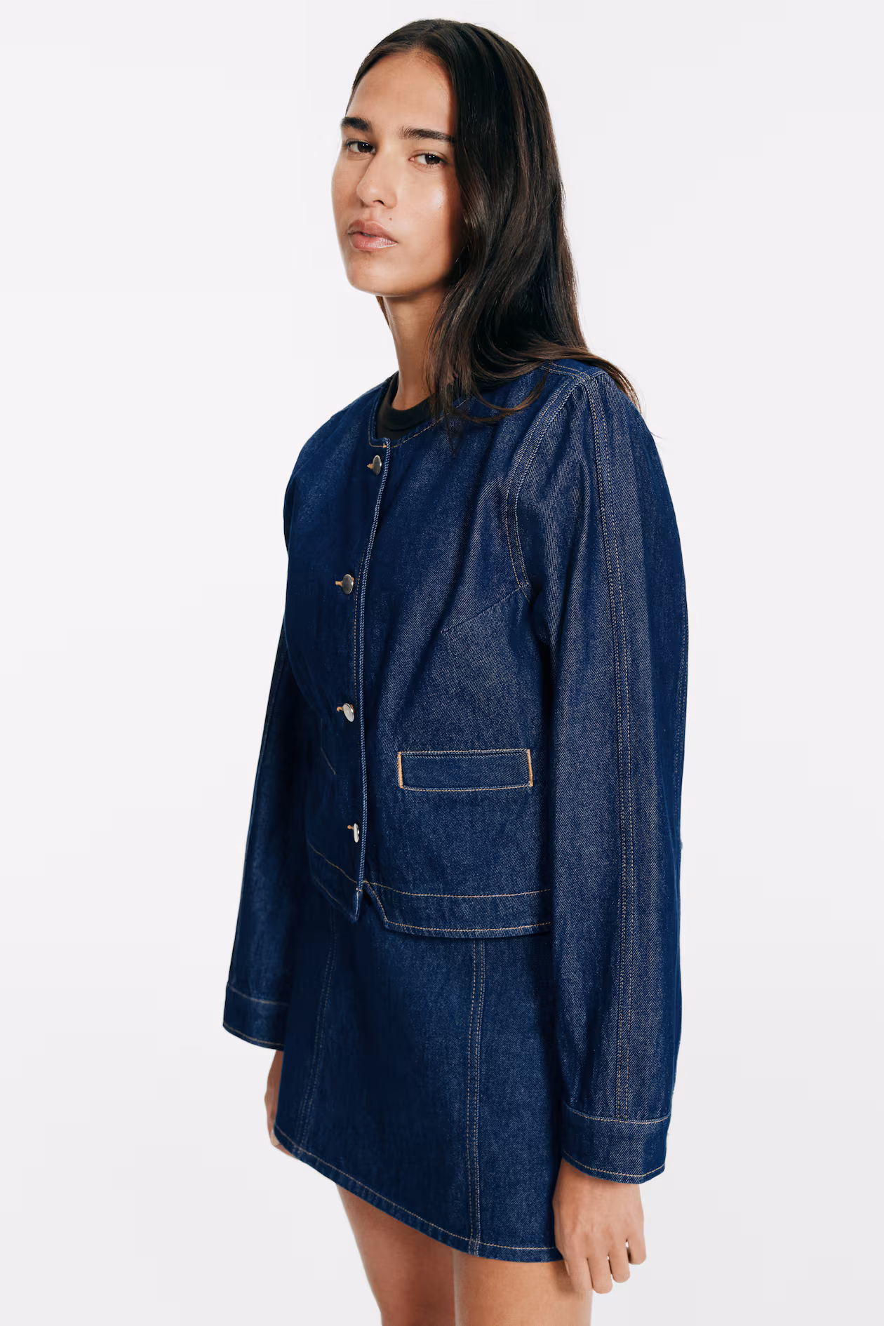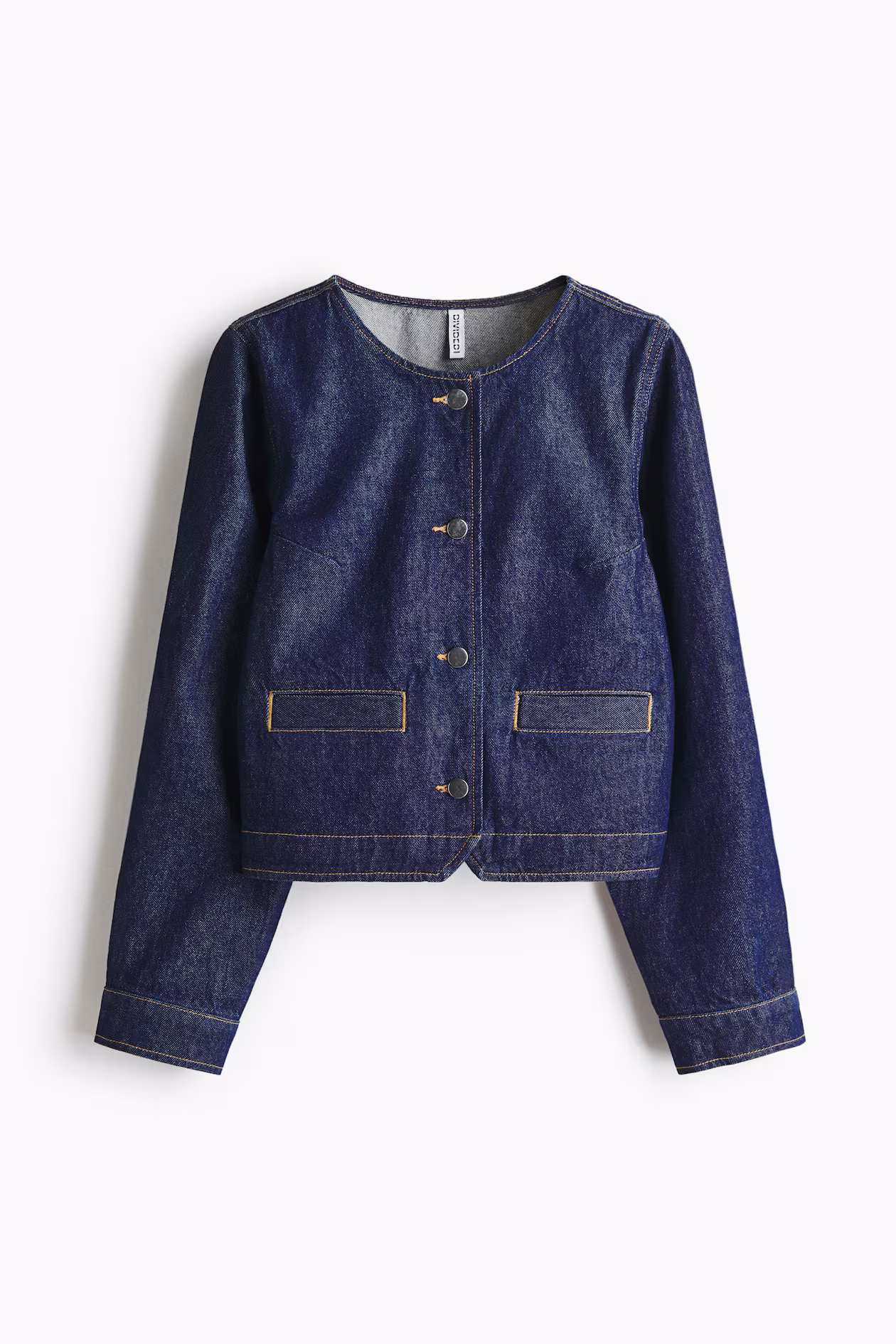 Short, fitted jacket in rigid cotton denim. Round neckline, buttons at front, welt front pockets, and a yoke at back. Long sleeves with button at cuffs.
