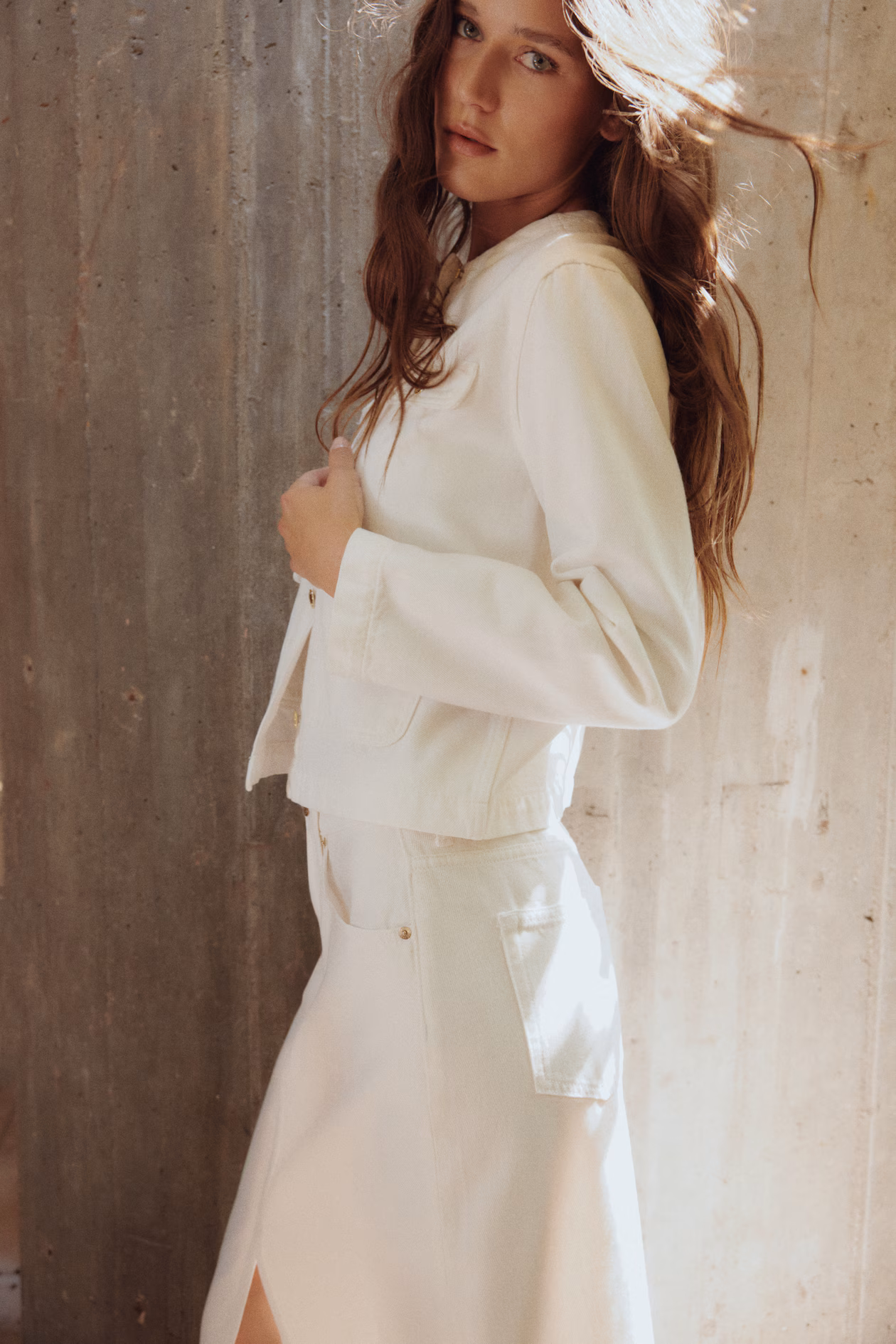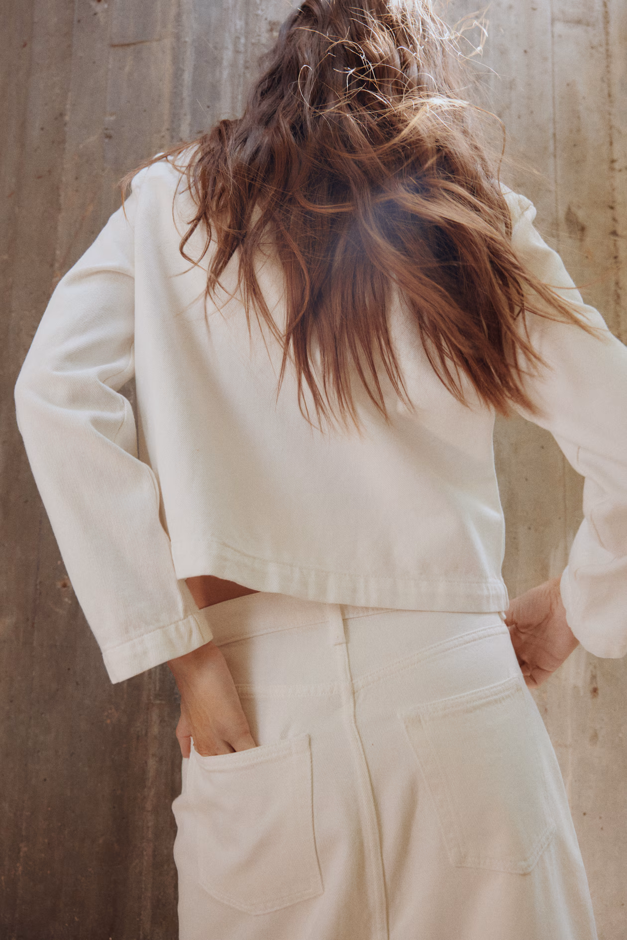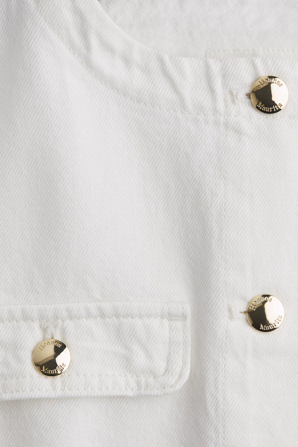 Jacket in rigid cotton denim. Round neckline, buttons at front, slightly forward-facing shoulder seams, and long sleeves. Decorative chest pocket flaps with button and patch front pockets with button.