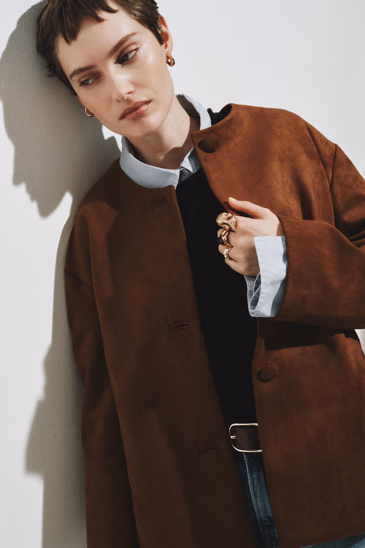 Jacket in woven fabric with a soft, napped finish. Round neckline, covered buttons at front, and welt front pockets with a flap. Lined.