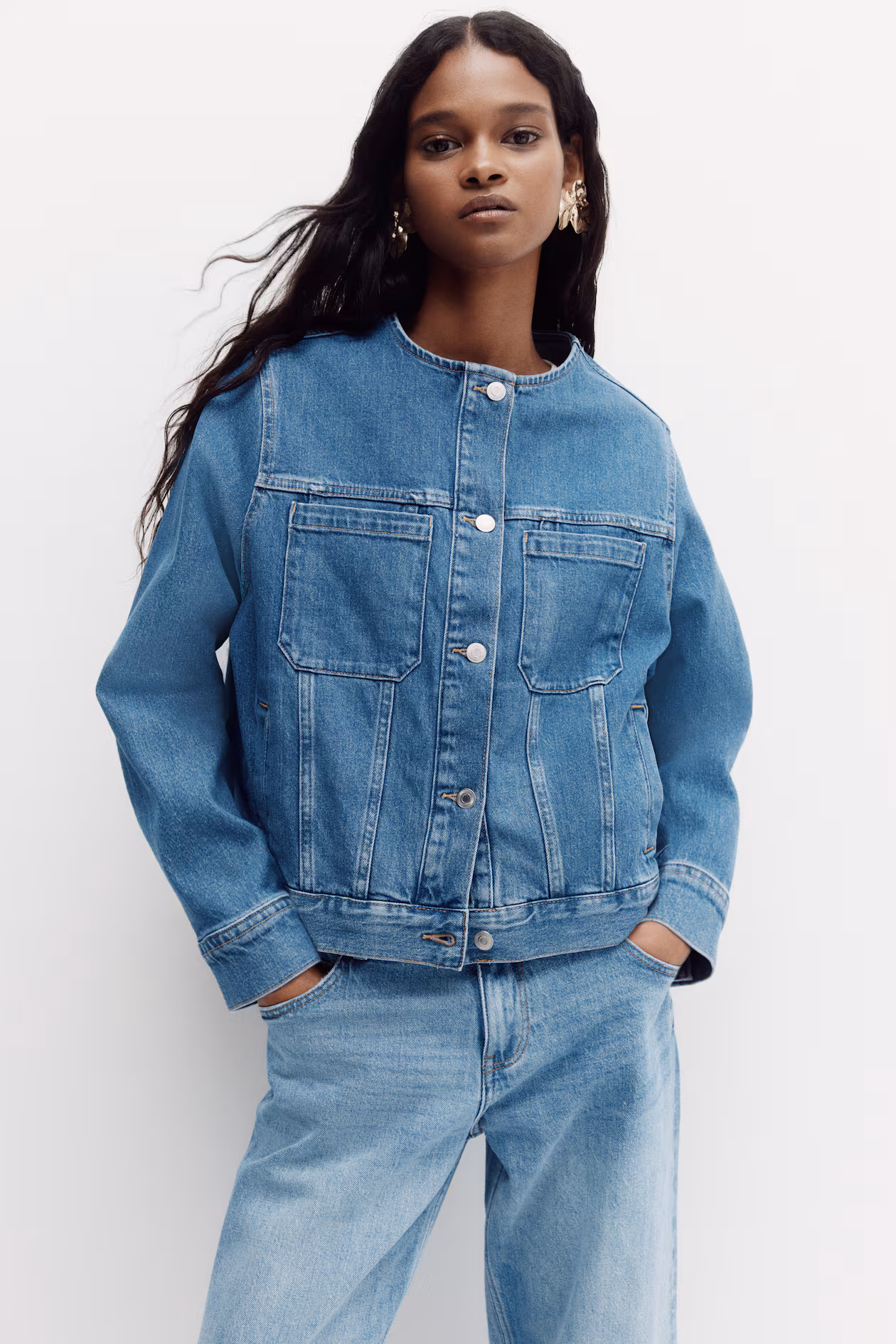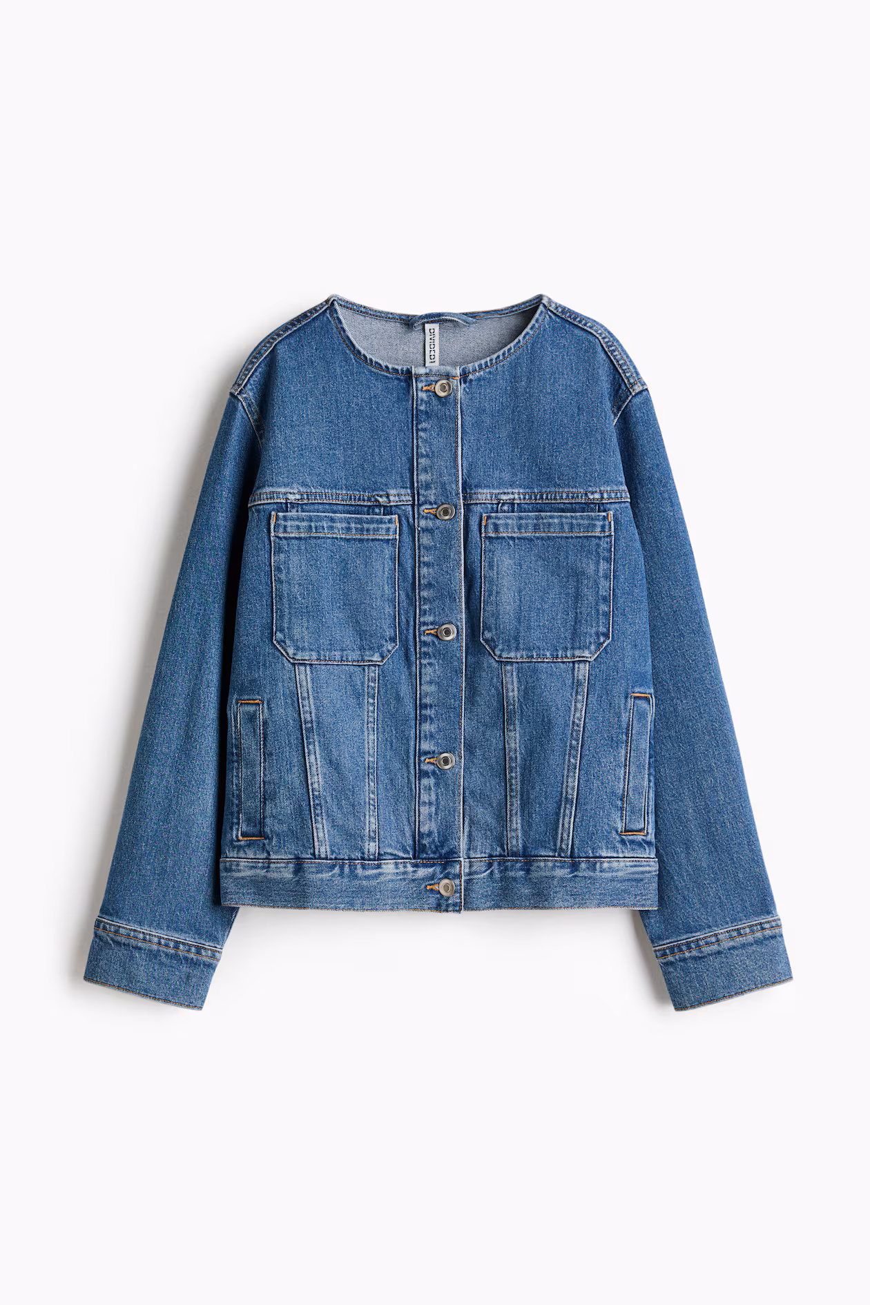 Collarless jacket in cotton denim with gentle stretch for good comfort. Round neckline, buttons at front, and a yoke at front and back. Open chest pockets, welt side pockets, dropped shoulders, and long sleeves with button at cuffs.