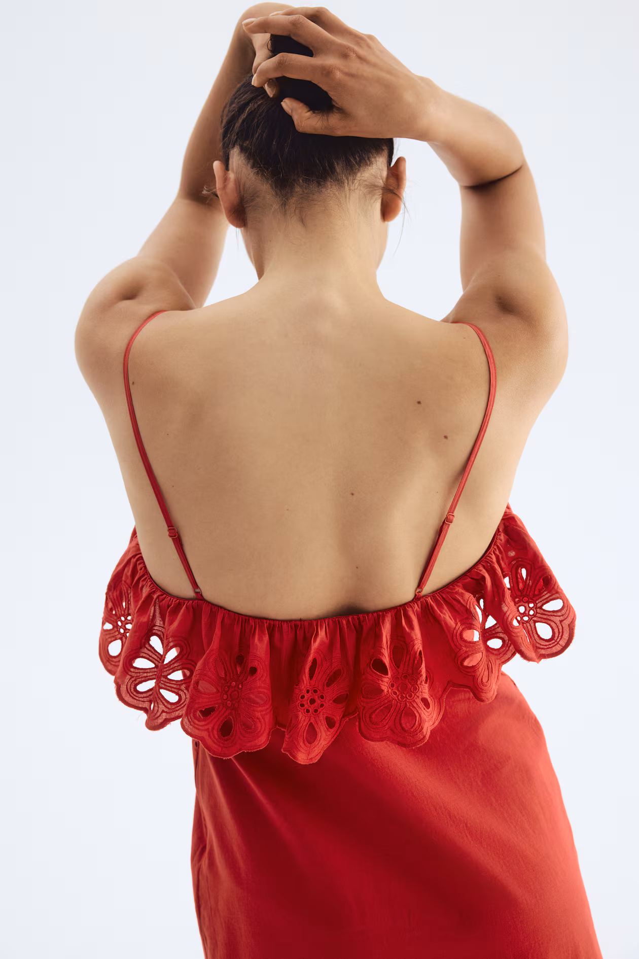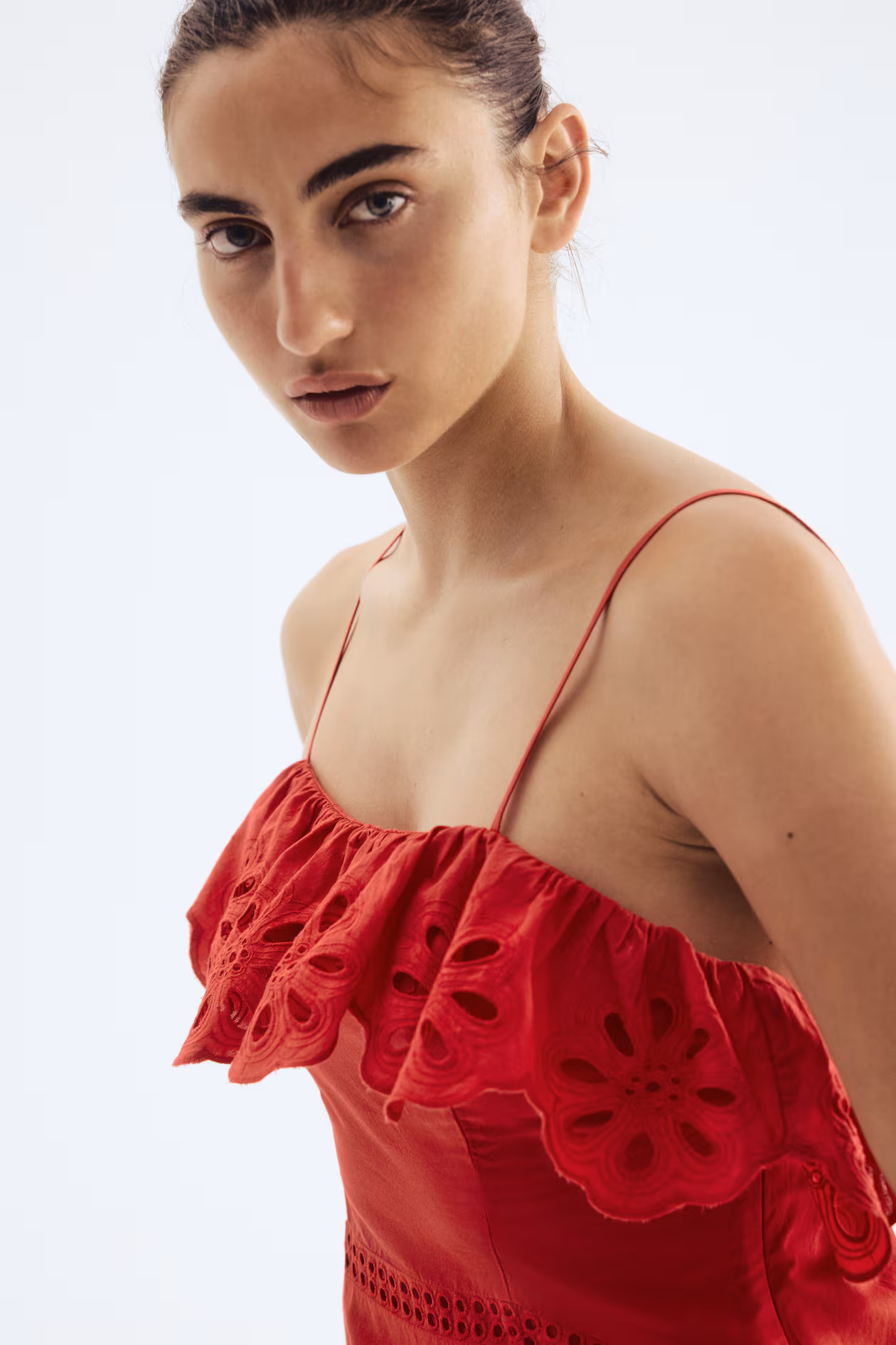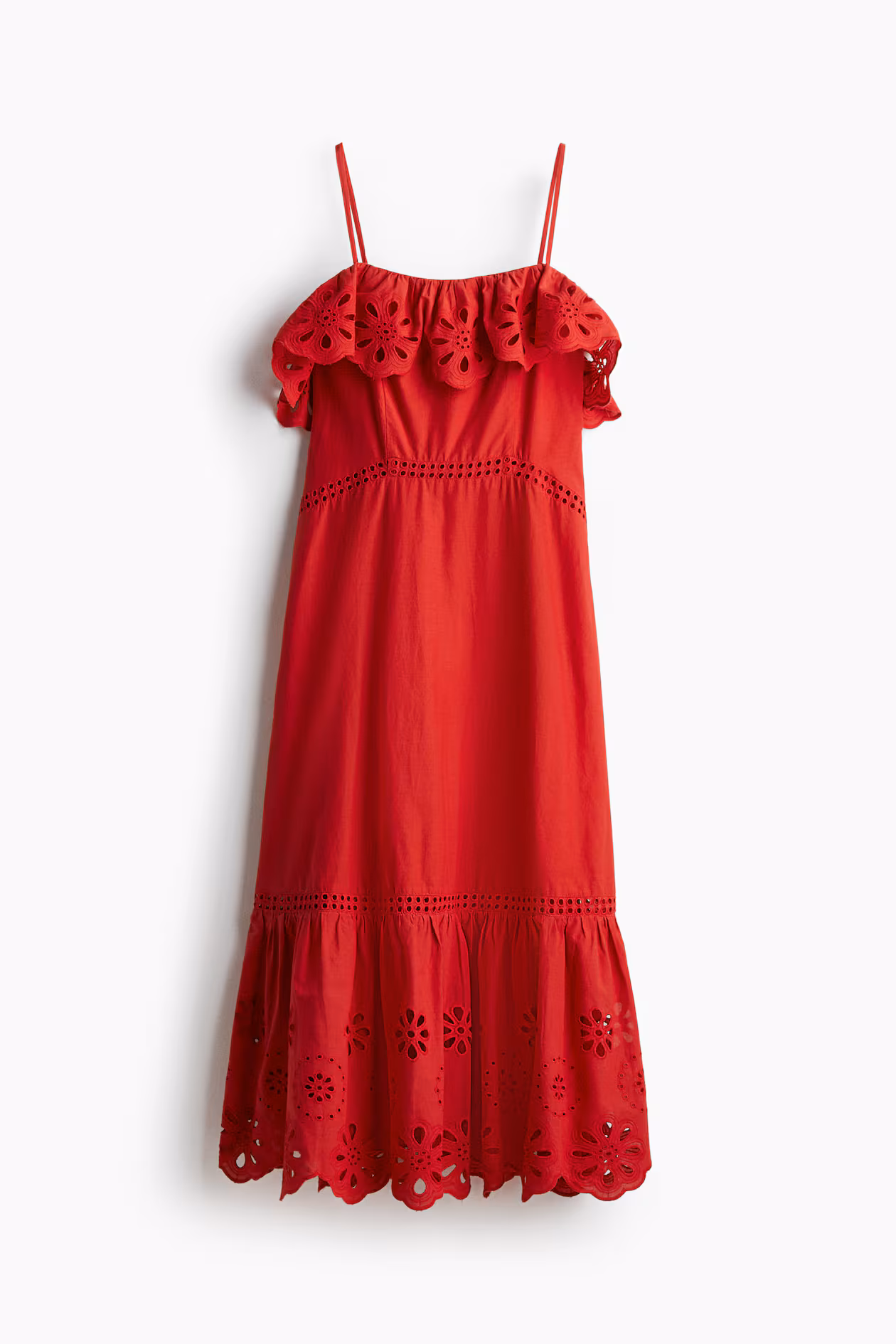 Calf-length dress in airy, woven cotton with eyelet-embroidered sections. Narrow, adjustable shoulder straps, straight neckline, wide flounce at top, and a concealed zipper at one side. Flared skirt. Lined.