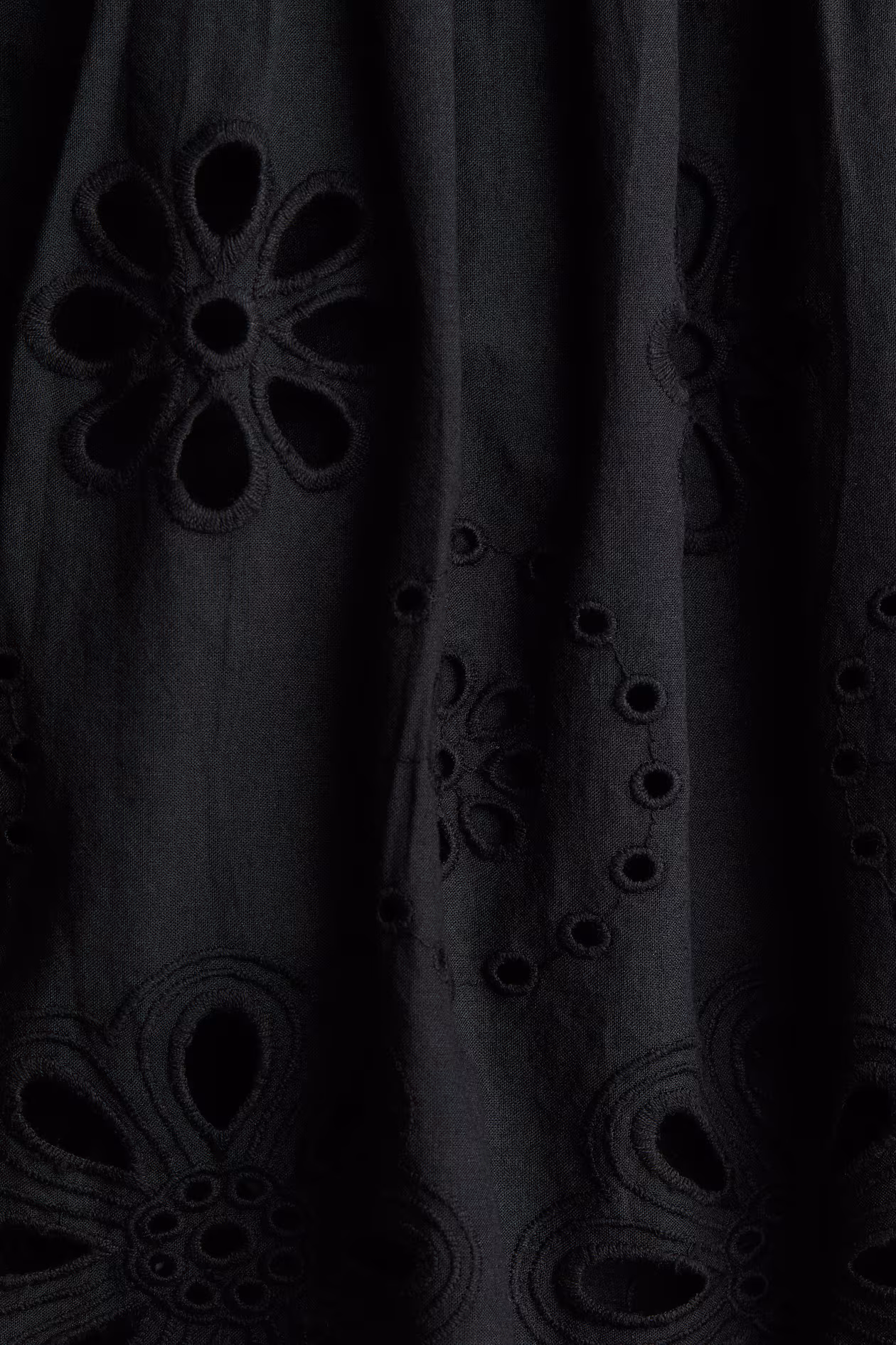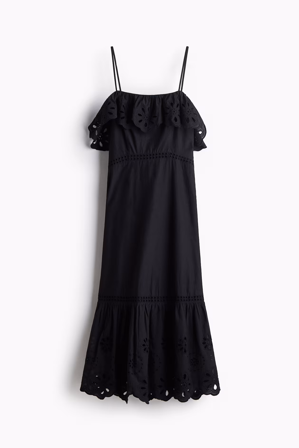 Calf-length dress in airy, woven cotton with eyelet-embroidered sections. Narrow, adjustable shoulder straps, straight neckline, wide flounce at top, and a concealed zipper at one side. Flared skirt. Lined.