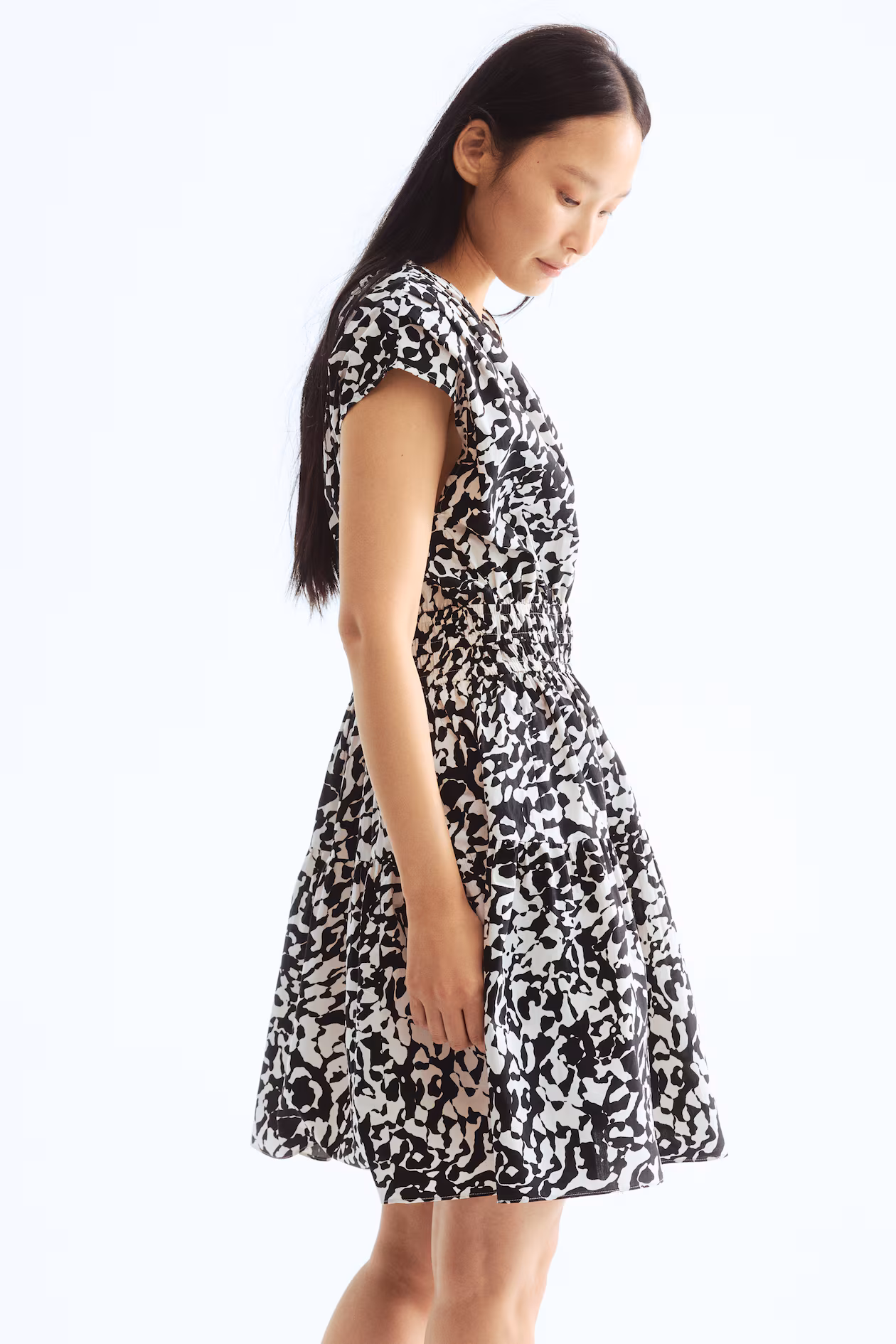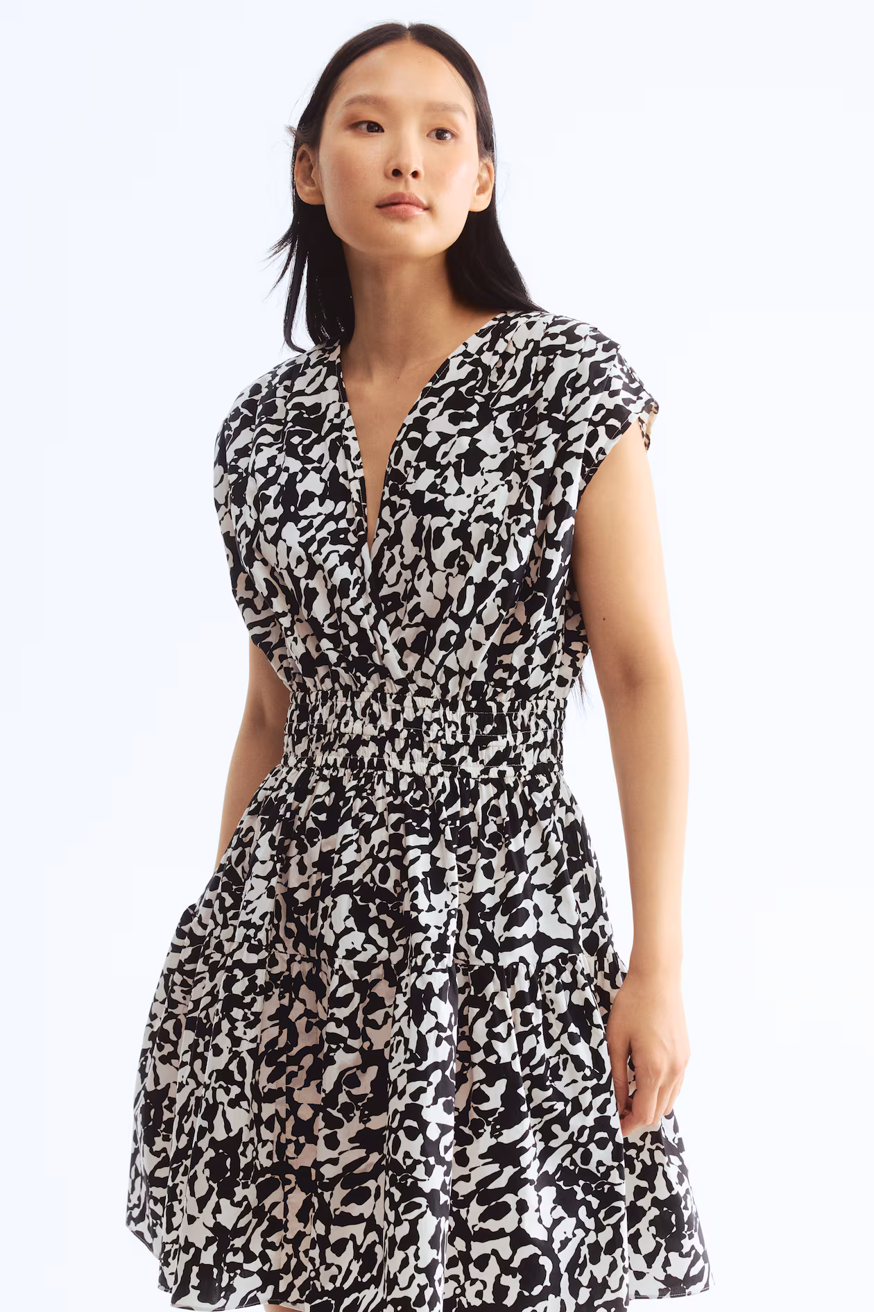 Short, sleeveless dress in woven cotton. V-shaped wrapover neckline, pleats over shoulders, and smocked elastic below bust. Gently flared skirt with a gathered seam. Unlined.