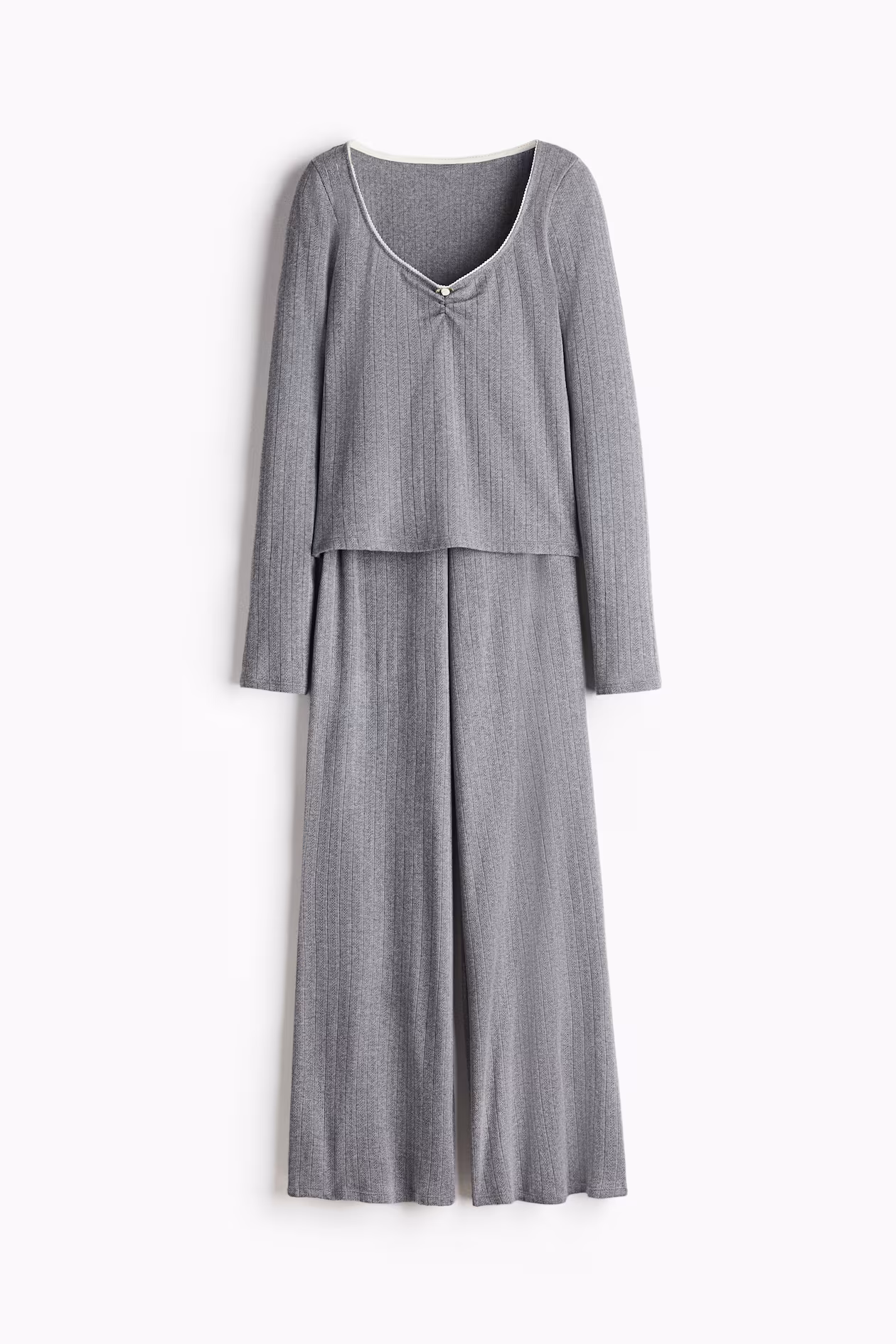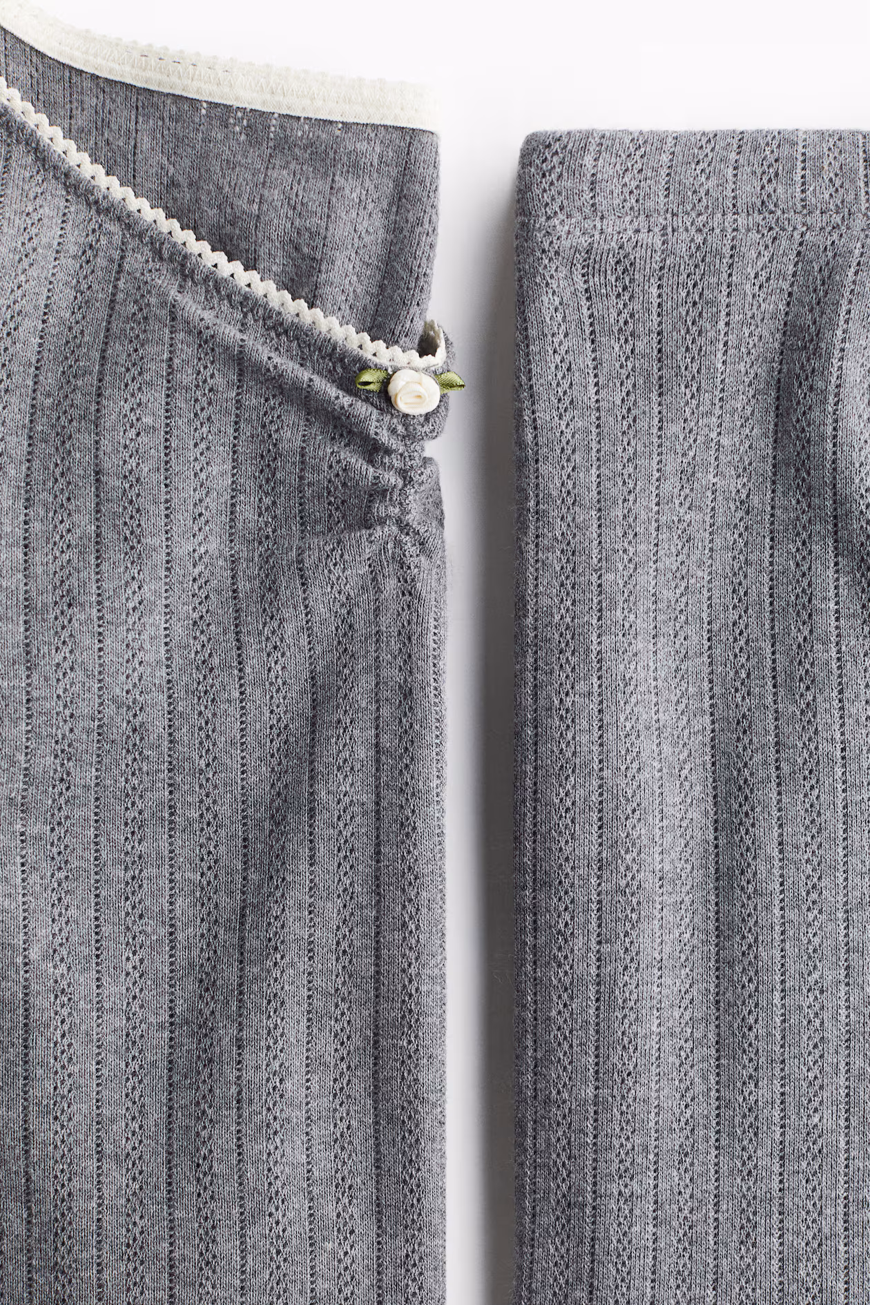 Pajamas in soft cotton pointelle jersey with a top and pants. Top with a low-cut, picot-trimmed neckline with a satin rose appliqué, a gathered seam at front, and long sleeves. Wide-leg pants with covered elastic and a satin rose appliqué at waistband.