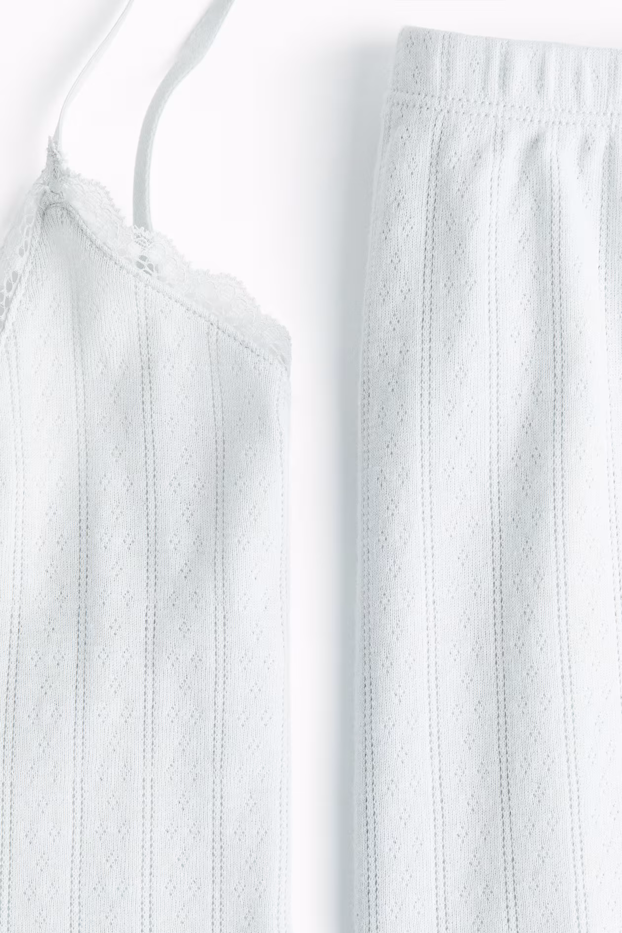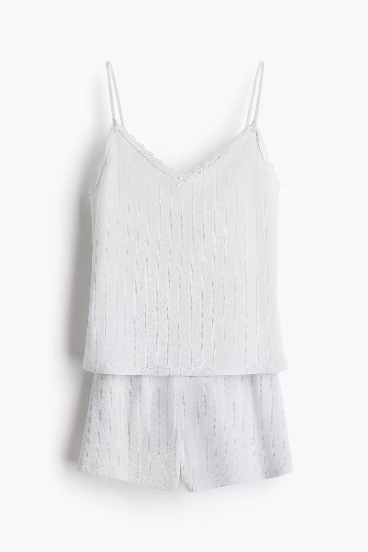 Pajamas in cotton pointelle jersey with a camisole top and shorts. Top with narrow, adjustable shoulder straps, V-neck, and lace trim around upper edge. Shorts with covered elastic at waistband.