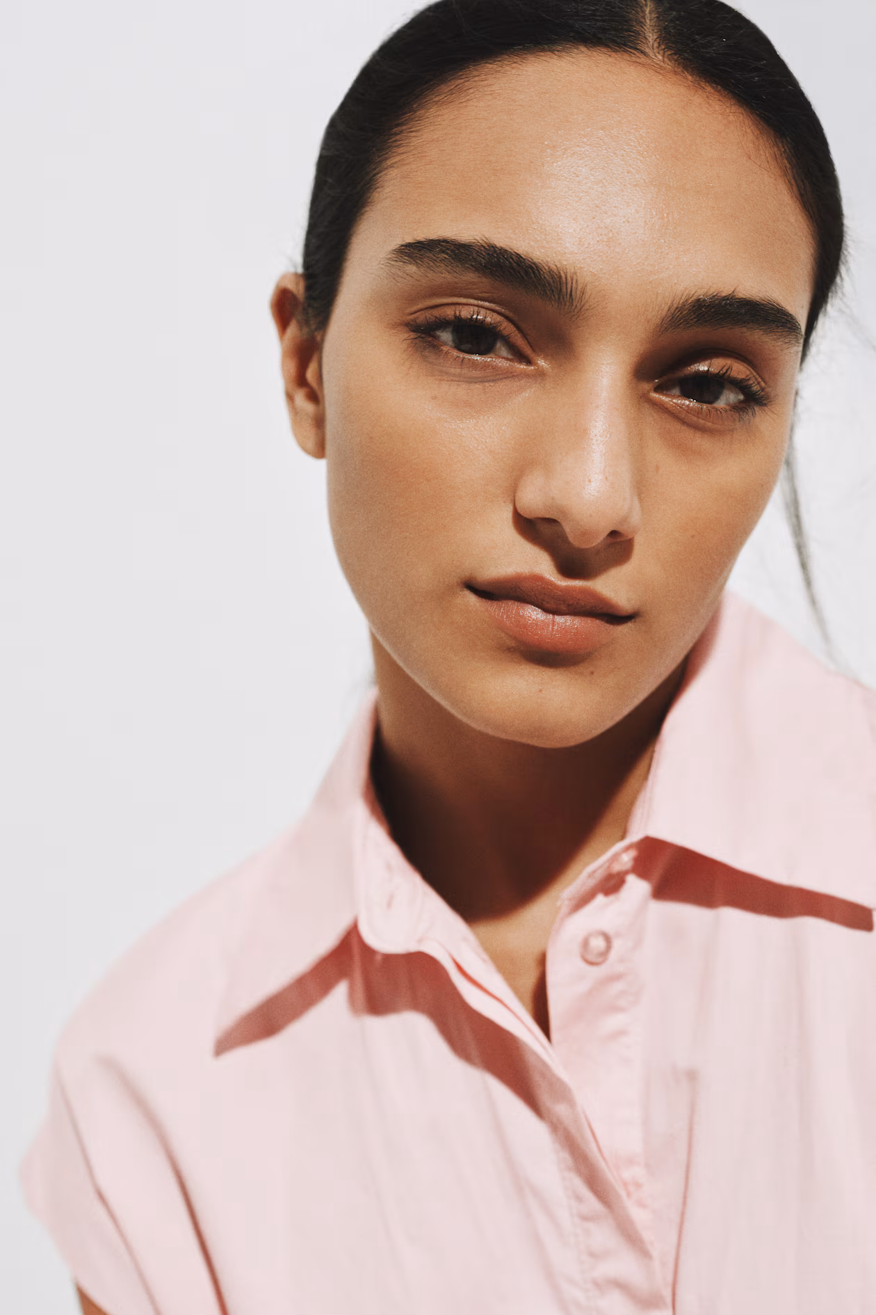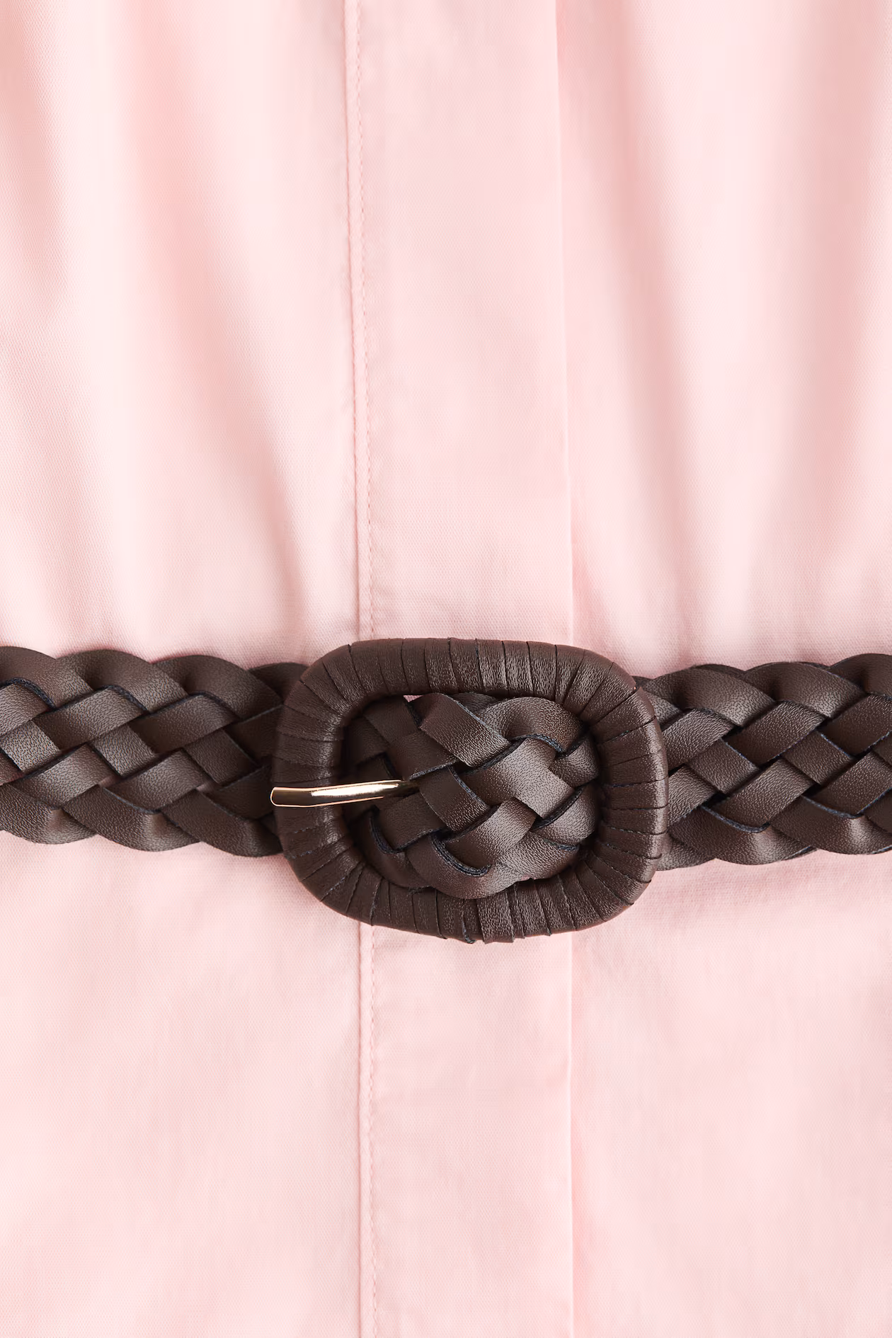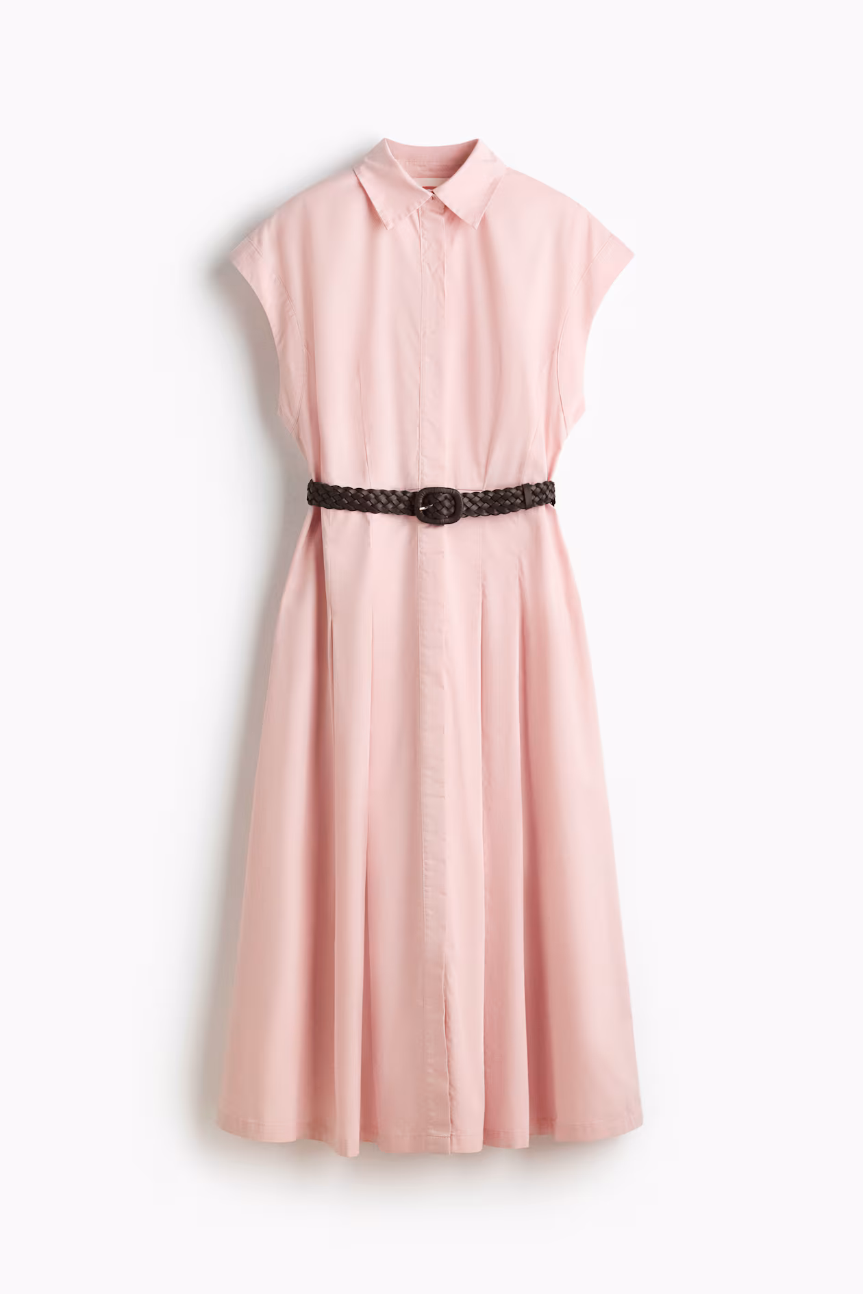Calf-length dress in crisp cotton poplin with a braided belt in coated fabric. Collar, yoke at back, concealed buttons at front, and cap sleeves. Gently flared skirt. Unlined.