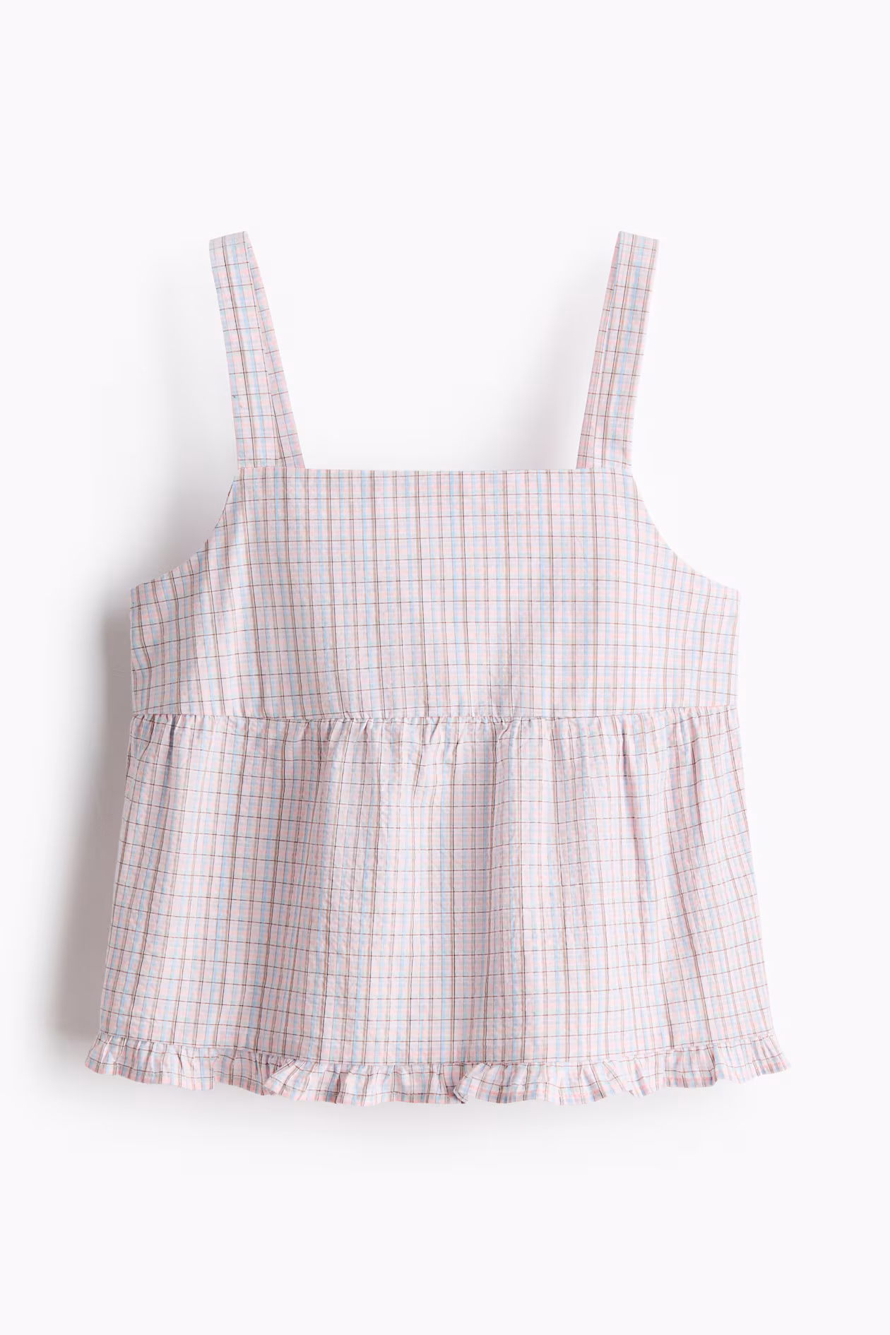 Top in cotton seersucker with a gathered seam below bust for a gently flared silhouette. Wide shoulder straps, square neckline, and an opening at back with two sets of narrow ties. Ruffle trim at hem.