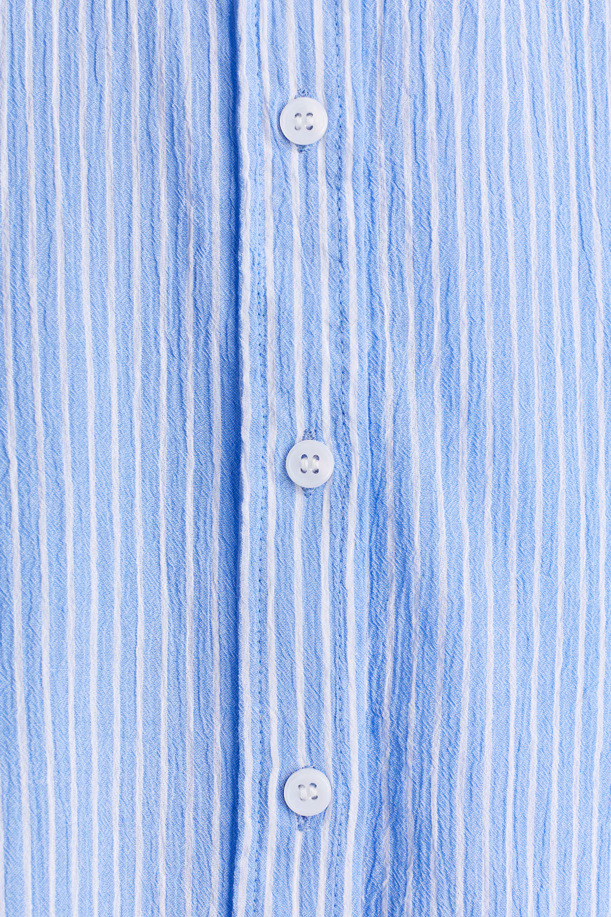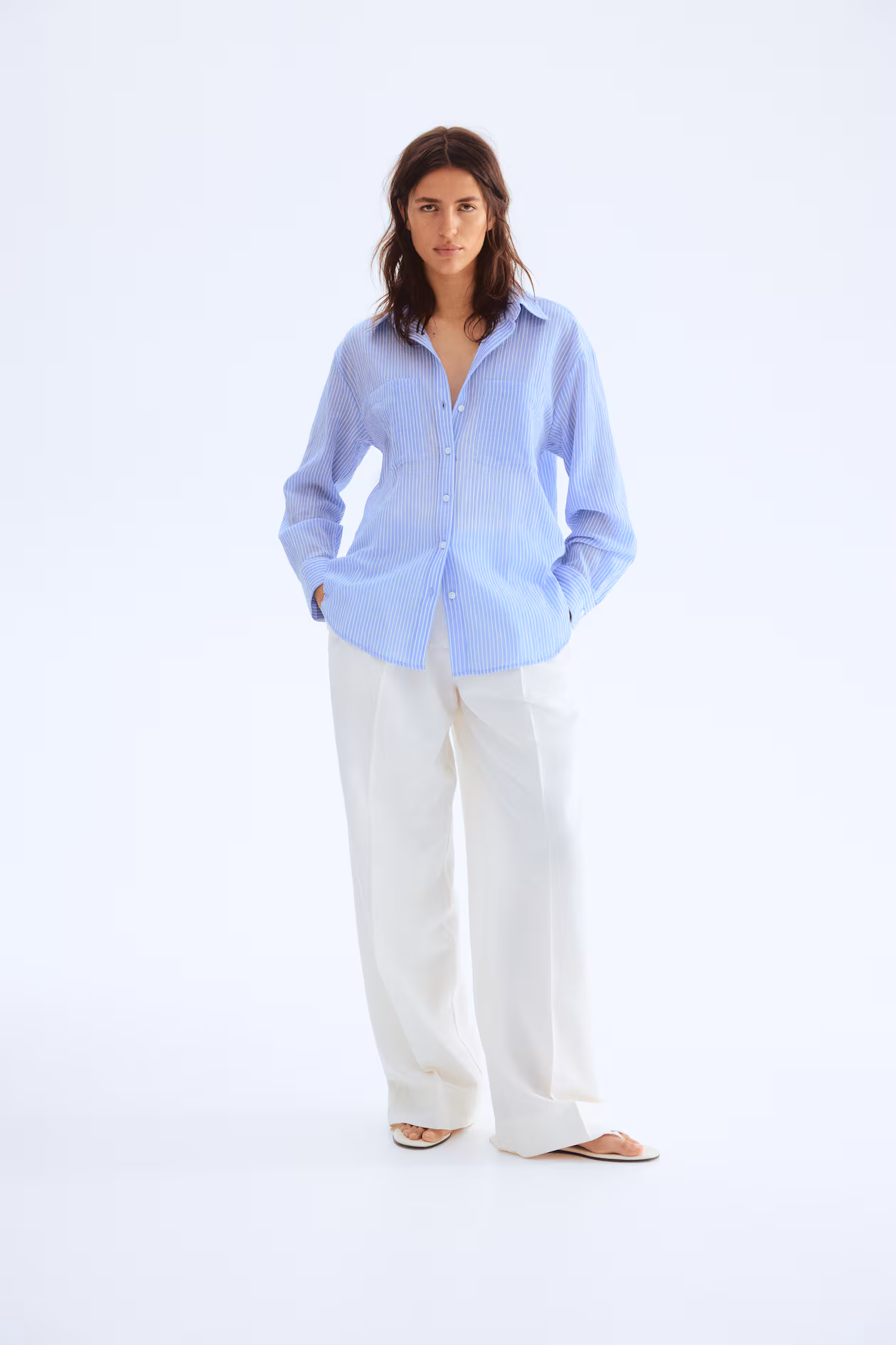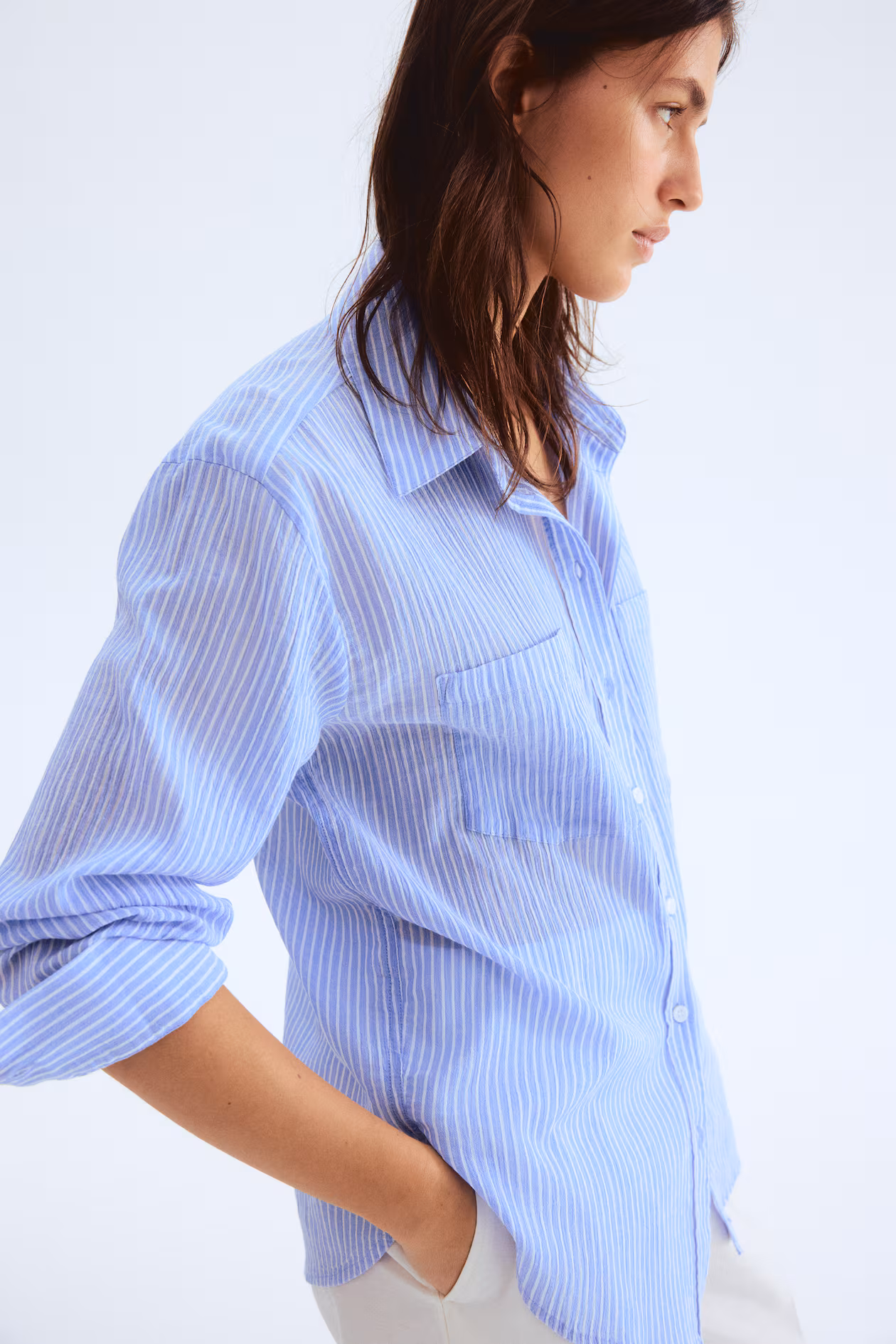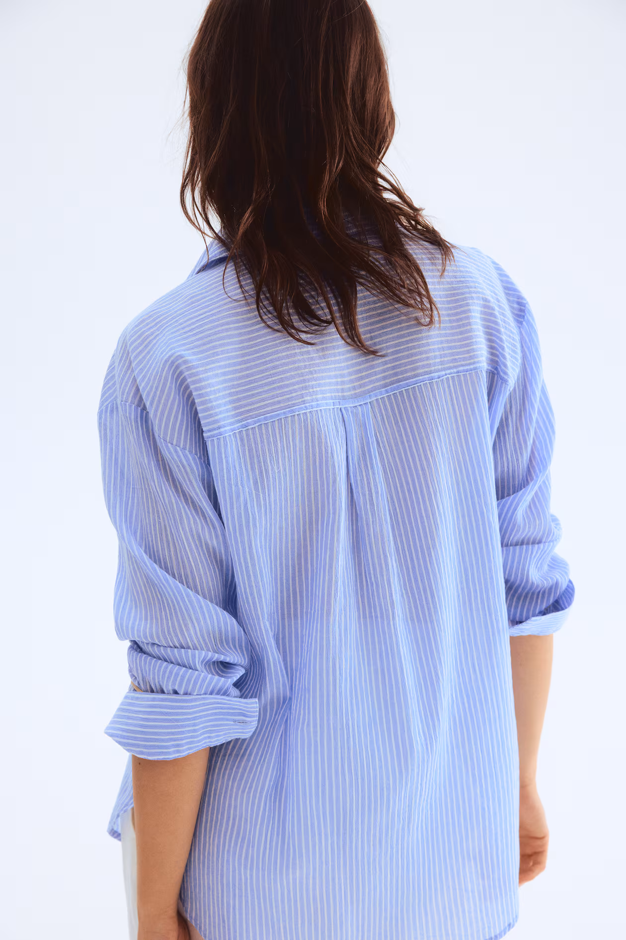 Loose-fit shirt in soft, woven cotton fabric. Collar, buttons at front, and yoke at back with box pleat. Open chest pockets, dropped shoulders, and long sleeves with button at cuffs. Gently rounded hem.
