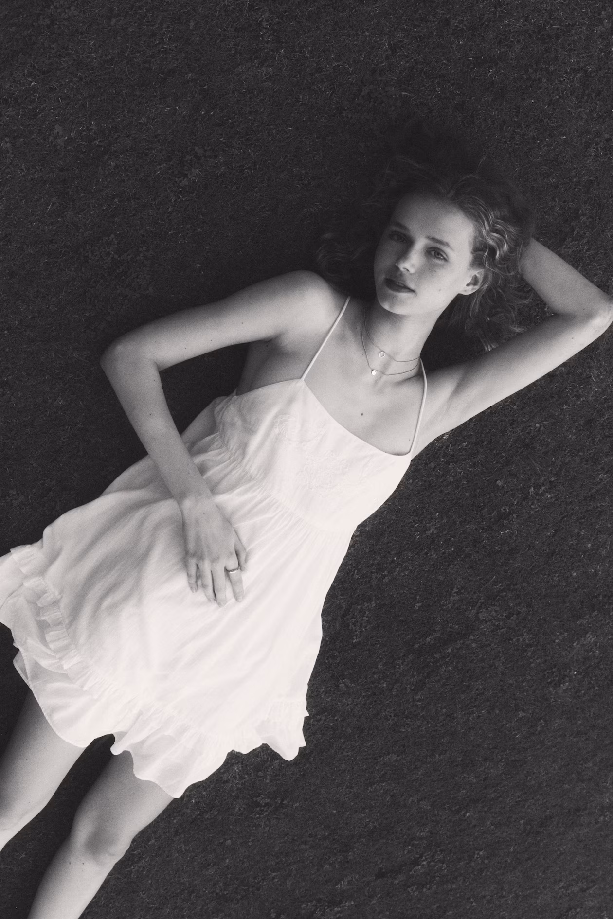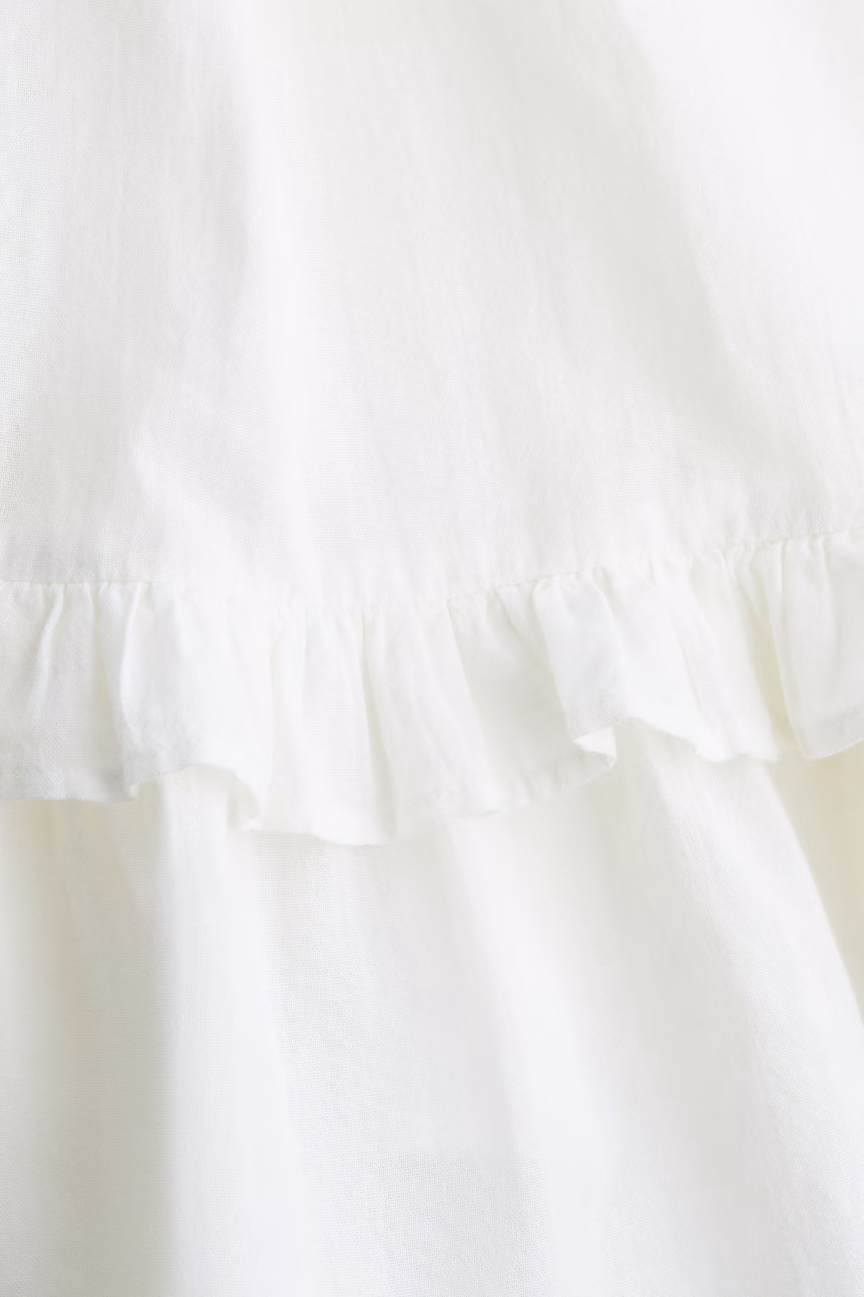 Short dress in soft, woven cotton with embroidered motif at bust. Extra-narrow shoulder straps crossed at back, square neckline, and narrow elastic at back. Gathered seam below bust, gently flared skirt, and ruffle trim above hem. Lined.