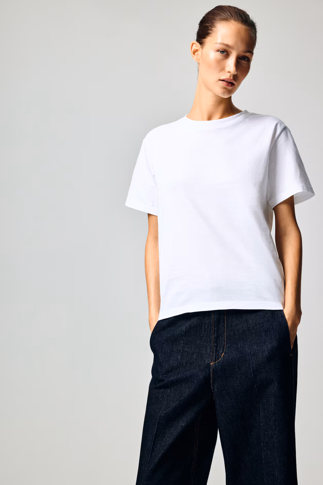 Straight-cut T-shirt in soft cotton jersey with ribbed crew neck and gently dropped shoulders.