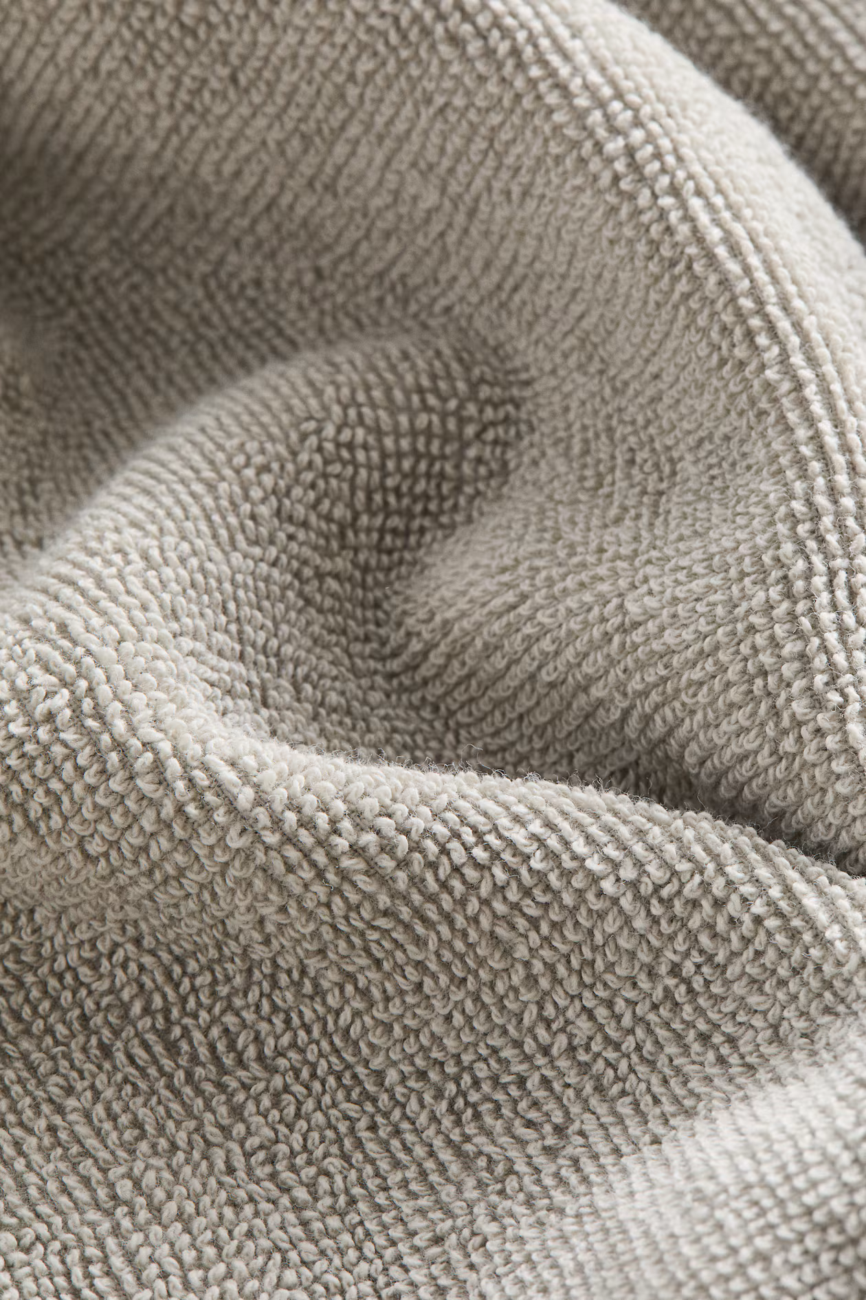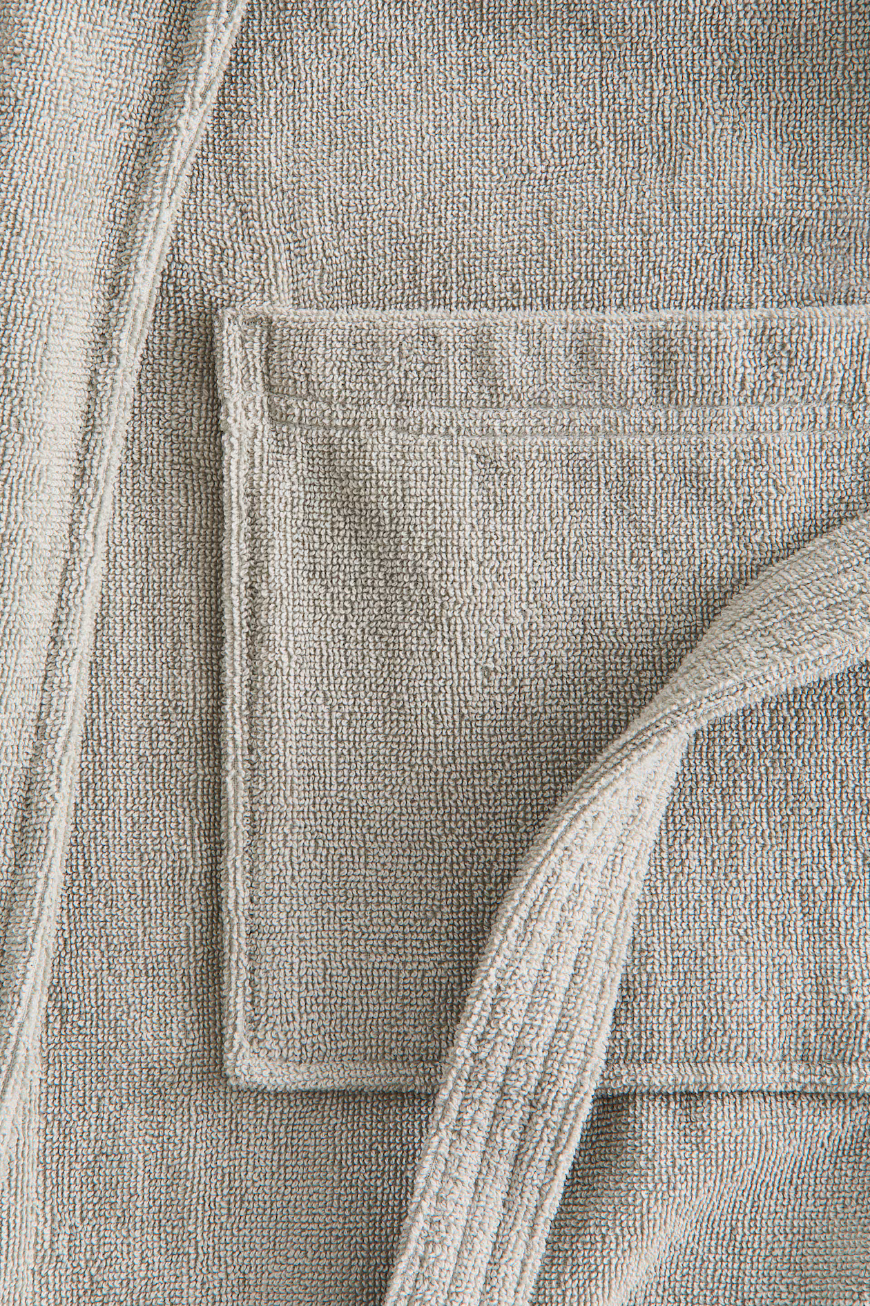 Bathrobe in soft cotton terry. Shawl collar, front pockets, and a removable tie belt at waist.