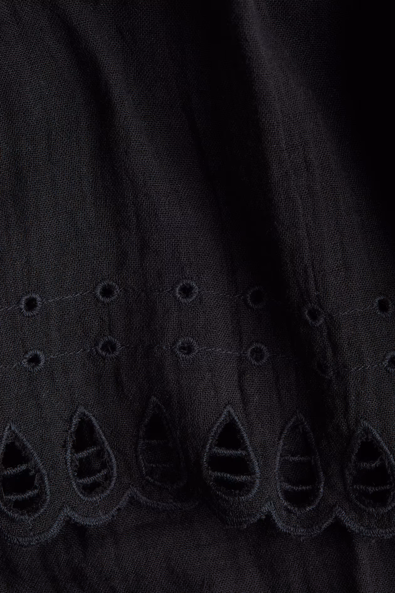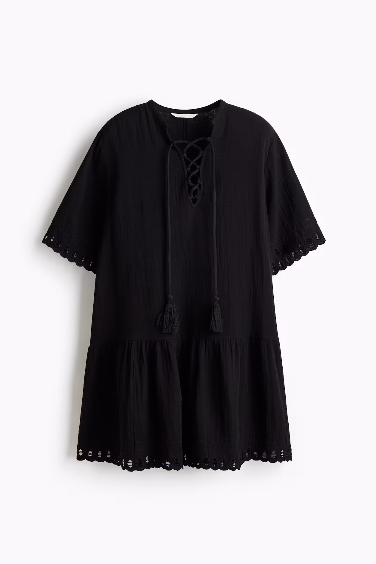 Short, loose-fit dress in soft cotton muslin. Band collar, V-shaped lace-up opening at front with tasseled laces, and short sleeves. Decorative eyelet embroidery at cuffs and hem and a gathered seam above hem for added volume. Unlined.