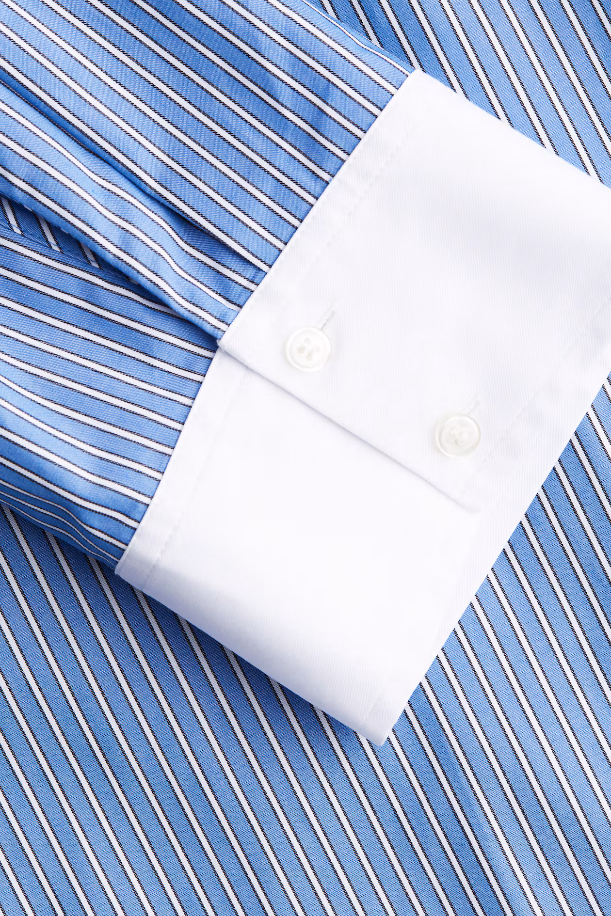 Short dress in soft cotton twill. Collar, placket at front with concealed buttons, and a yoke at back with box pleat. Dropped shoulders and 3/4-length sleeves with button at cuffs. Rounded hem at front and straight-cut hem at back.