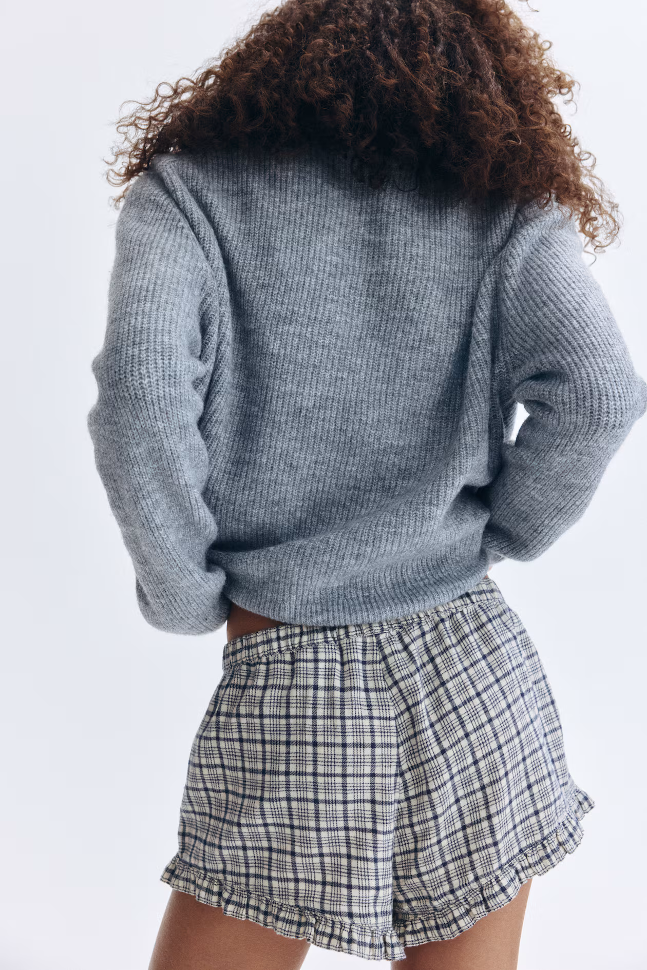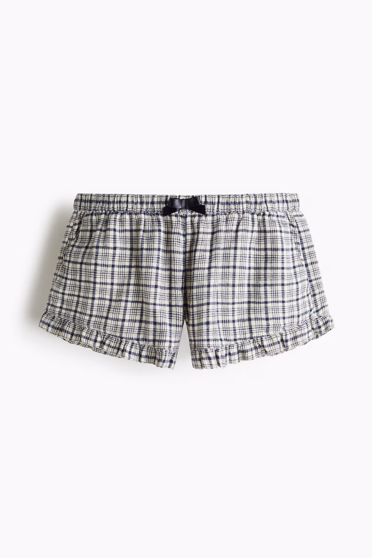 Shorts in cotton twill. Regular waist, covered elastic at waistband, and a decorative satin bow at front. Discreet side pockets and ruffle-trimmed hems.